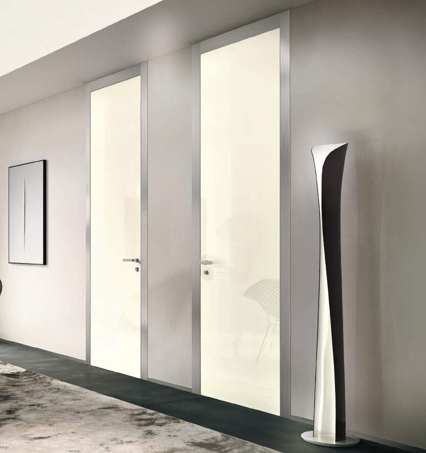 Glossy white lacquered hinged door, door frame S90, aluminium finishing-lists.