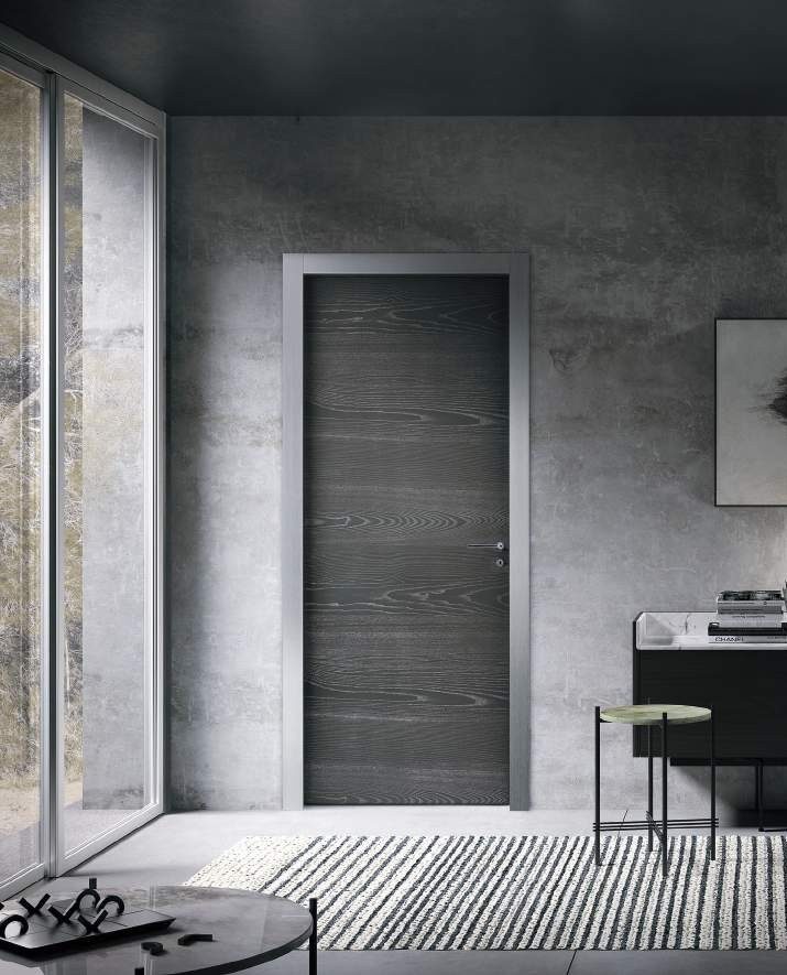 Grey limed oak hinged door, door frame S90. From the technical point of view, the innovative aspect includes the aluminium use which is presented in its natural brightness close to the wood and to the lacquered colours.