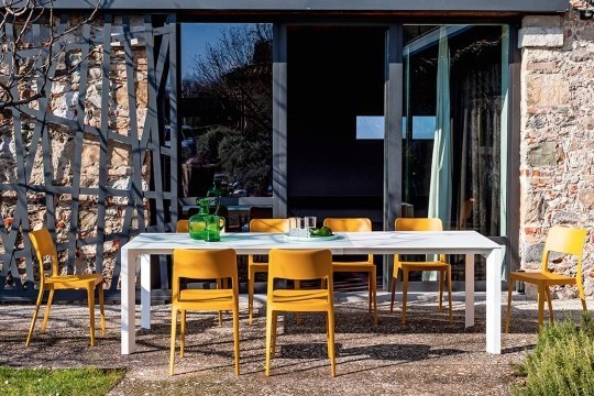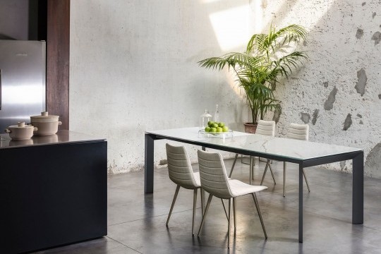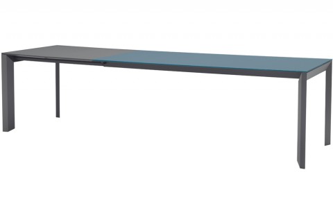 Extendable table with sliding base in painted steel. Top in melamine, wood, glass or ceramic.