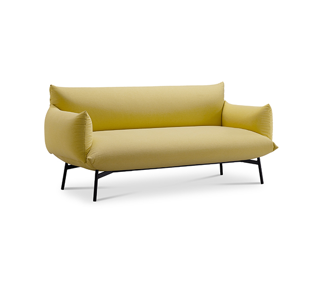 Two-seat and three-seat sofa with painted metal legs. Seat and backrest upholsteres in fabric. The Area sofa is also available in the version without armrests and in chaise lounge version.