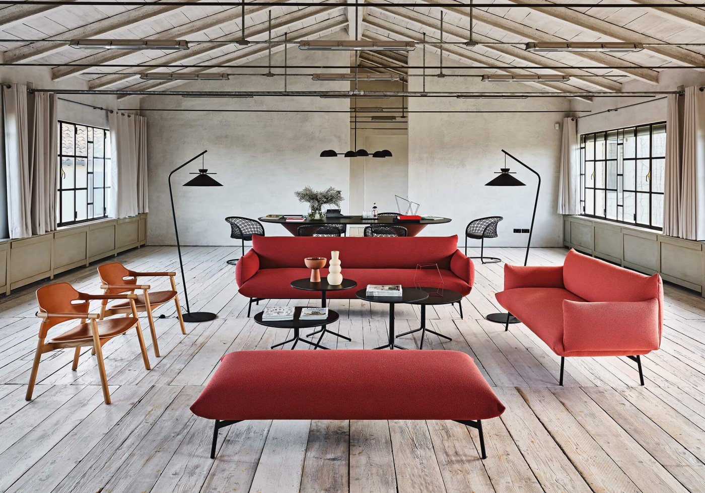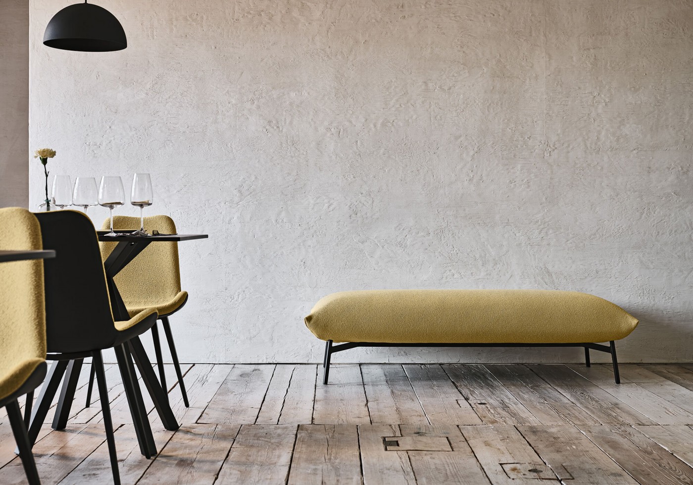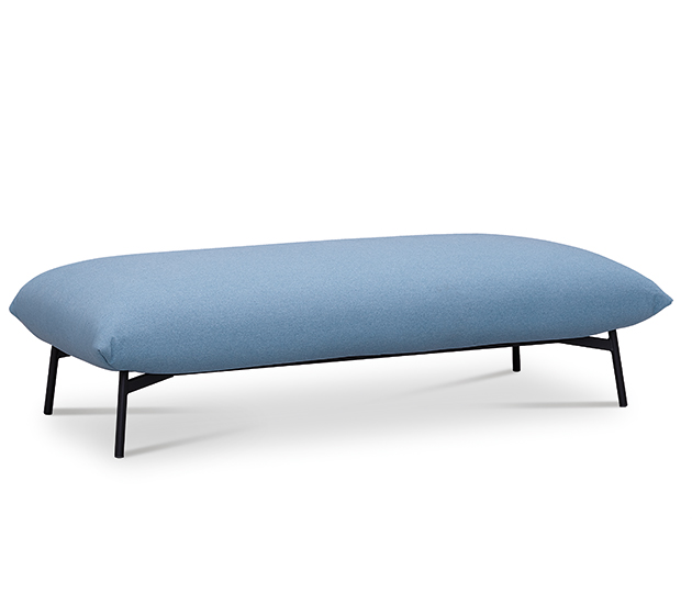 Pouf with four-legs base in lacquered steel. Soft cushion upholstered with fabric. The Area pouf is also available in two-seats version.