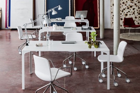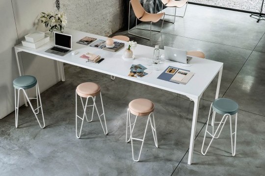 Fixed table with metal frame and top.