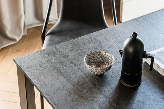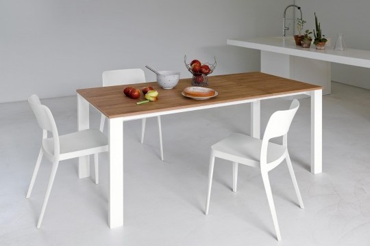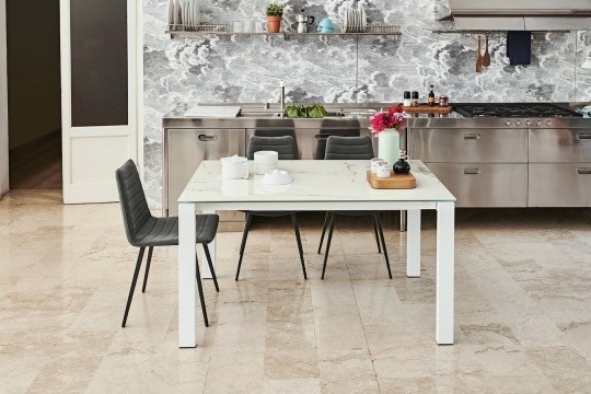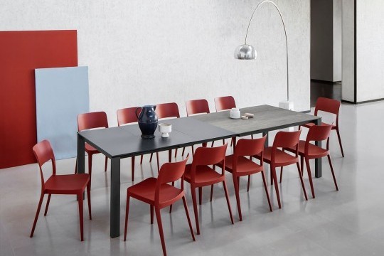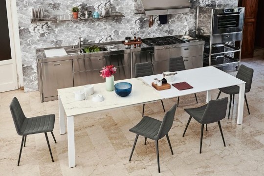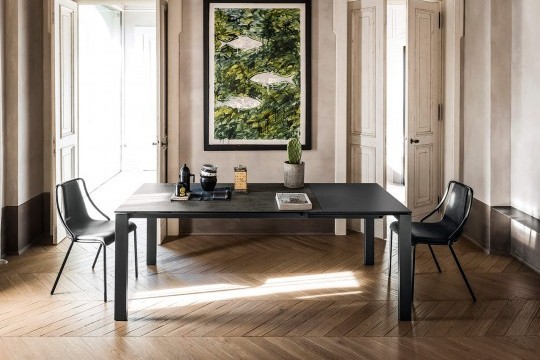 Badù extendable table with lacquered steel structure and top available in several materials and finishes.