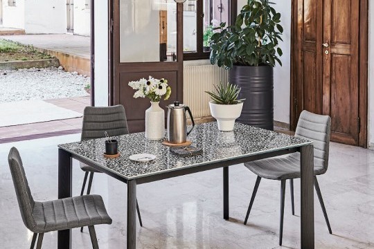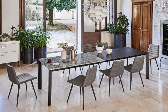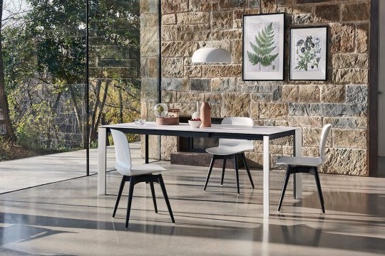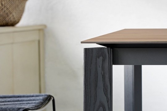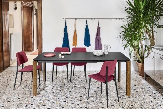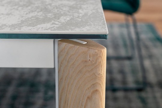 Extendable table with lacquered steel frame and legs covered in wood. Top available in melamine, lacquered wood, Fenix, crystal or crystalceramic.