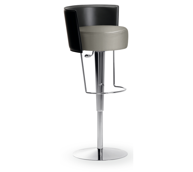 Swivel and high adjustable stool with round base, frame and footrest are in chrome. Seat and backrest upholstered in leather, faux leather, hide, fabric and custom’s fabric