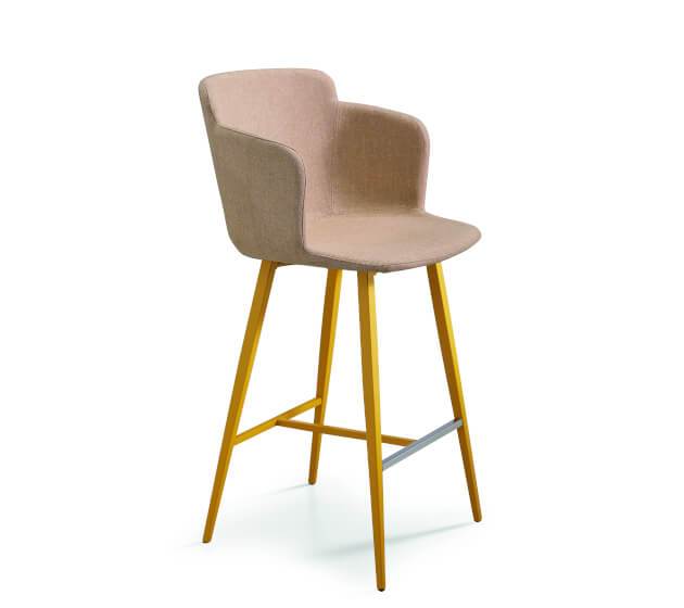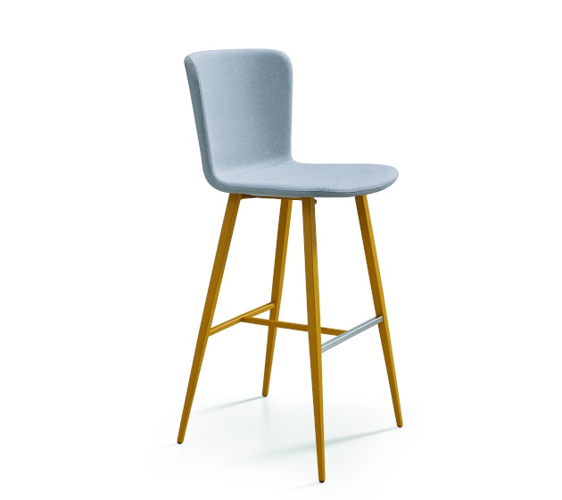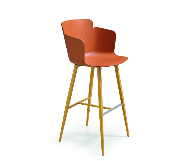 Bar stool with four legs base in lacquered steel and plastic shell. Optional: cushion upholstered in fabric, leather or faux leather. The stool in the version with plastic shell is also available in the version for outdoor use.