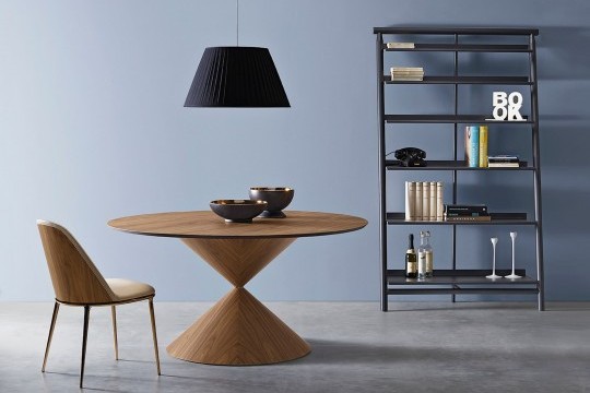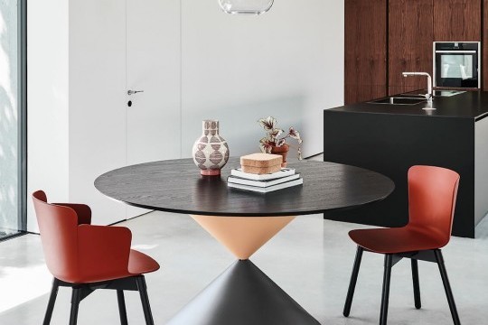 Fixed round table with solid or two-colored steel base. Wooden version available. Crystalceramic or wooden top.
