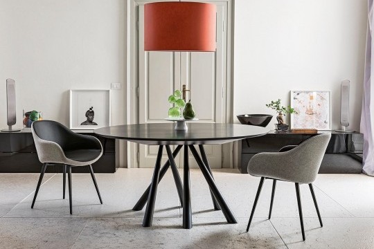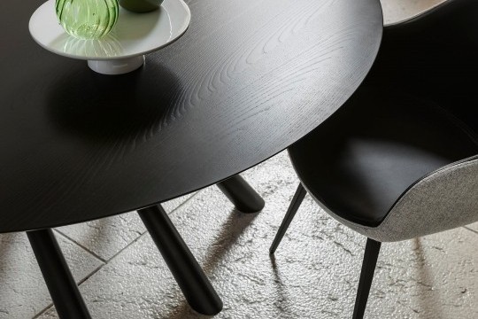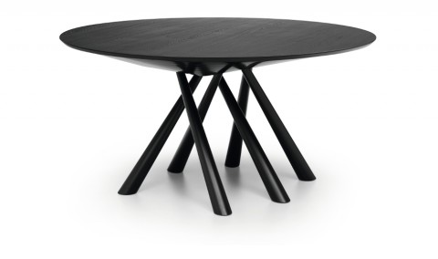 Fixed table with lacquered steel base. Top in veneered wood or crystalceramic.