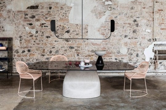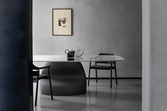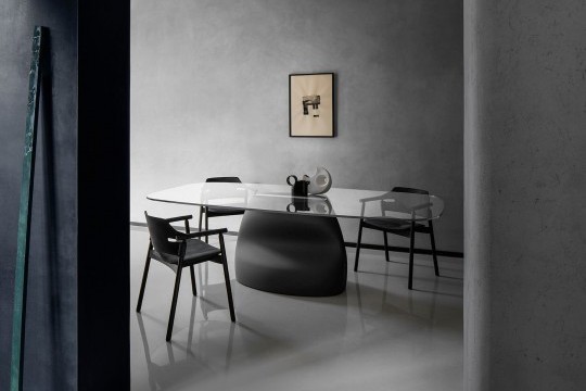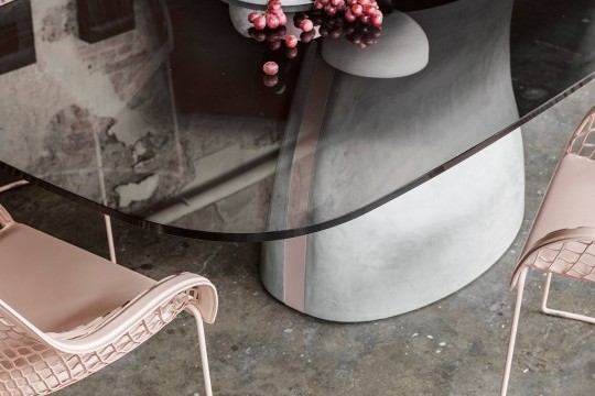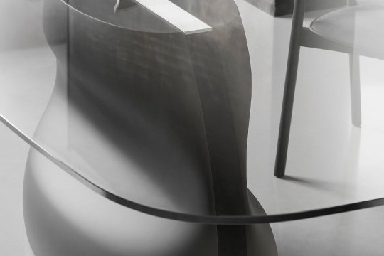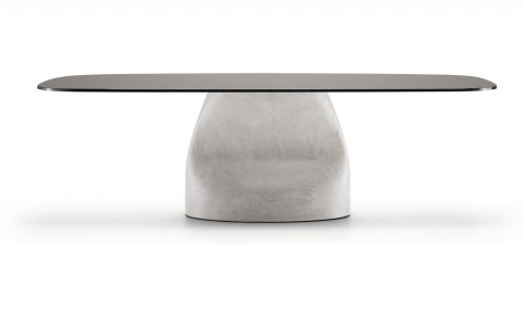 Fixed table with Baydur® base or Baydur® with brushed concrete effect, lacquered steel insert and crystal or crystalceramic rectangular top with rounded corners.