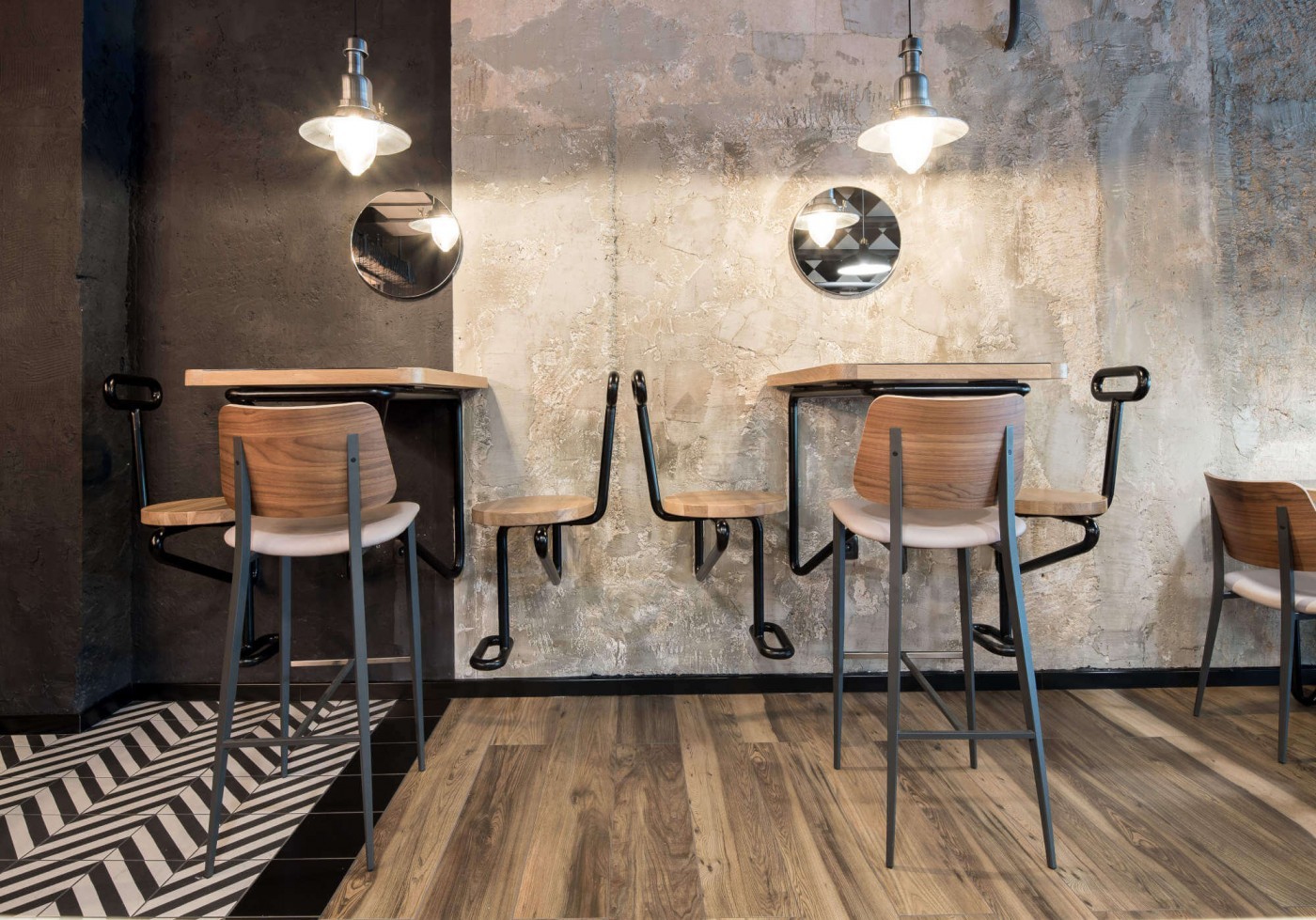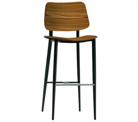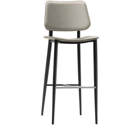 Stool with four-legs base in painted steel. Seat and backrest in leather, faux leather or fabric. Optional: wooden backrest’s back face.