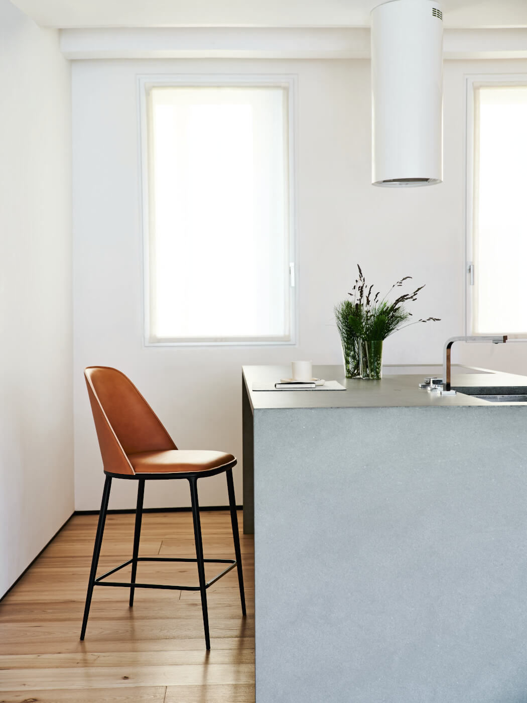 Stool with four legs base in steel. Seat and backrest upholstered in fabric, leather or faux leather also with different fabrics for front face and back face. Available in matte or glossy finish.
