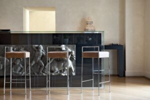 Barstool with four leg frame in chrome. Upholstered seat in hide, leather, ecoleather, fabric or custom’s fabric. Height seat: 65cm (25.6″) o 75cm (29.5″).
