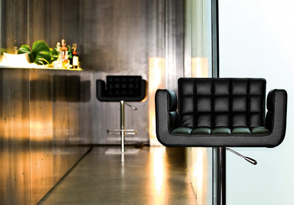 Swivel and high adjustable stool with square base and frame in chrome. Seat upholstered in leather, ecoleather, fabric or custom’s fabric. Chrome footrest. Seat height: 58 cm (22.8″) – 83 cm (32.7″).