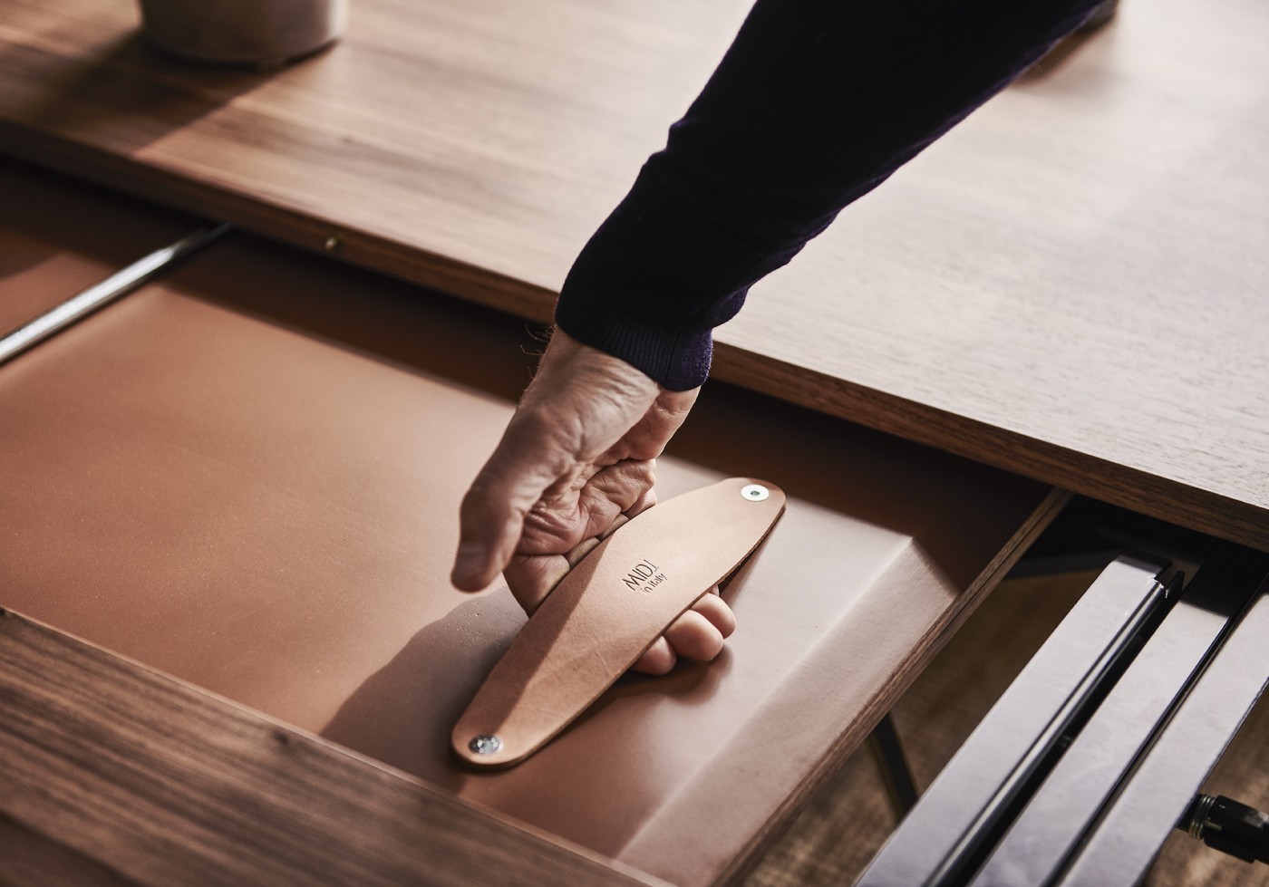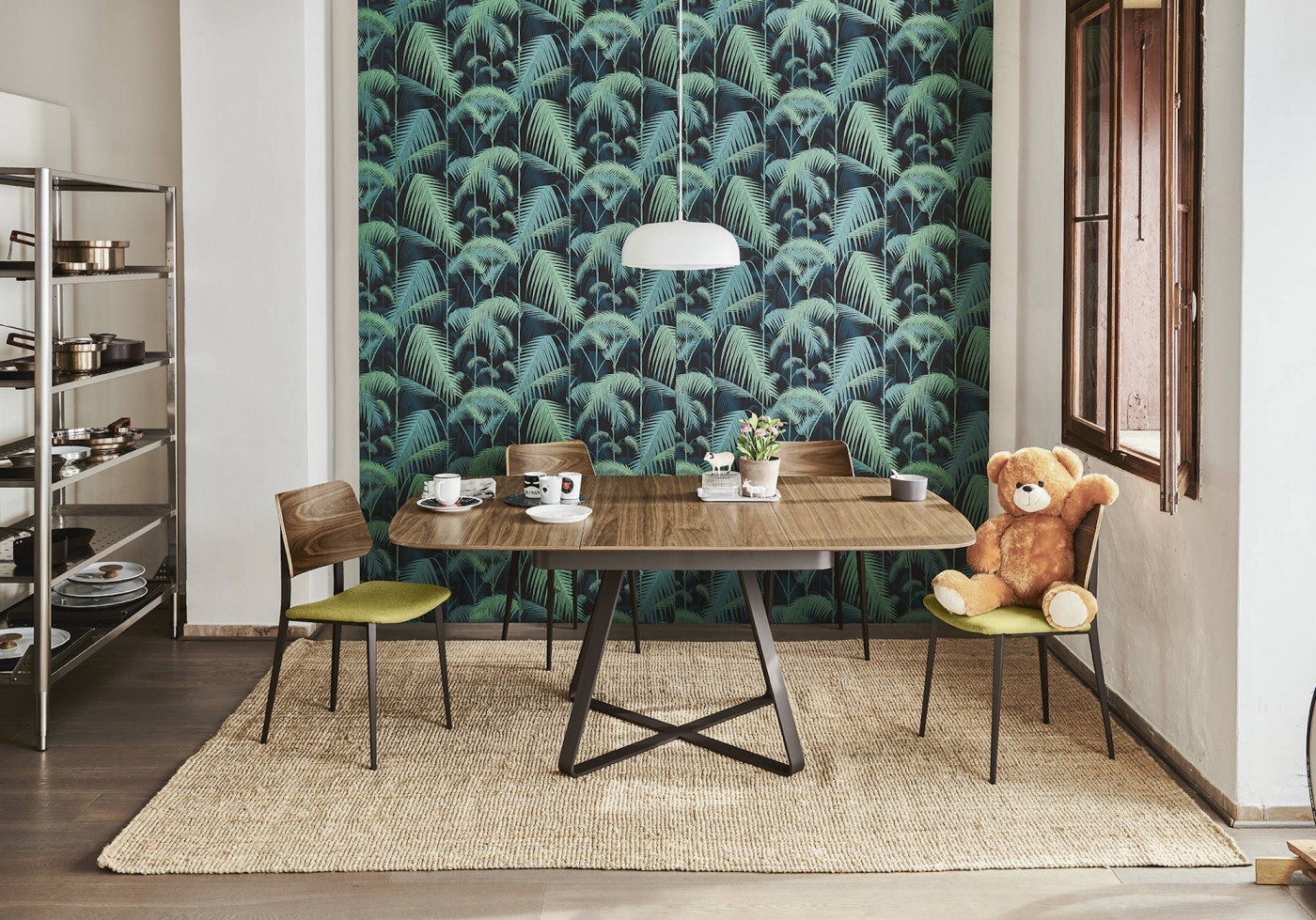 Extendable table with steel base. Wooden or crystalceramic top, matching extensions.