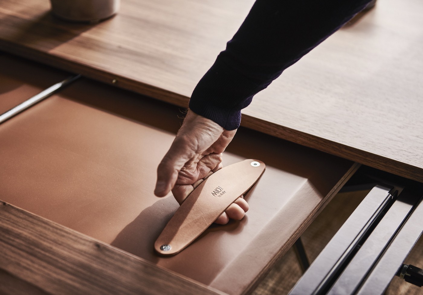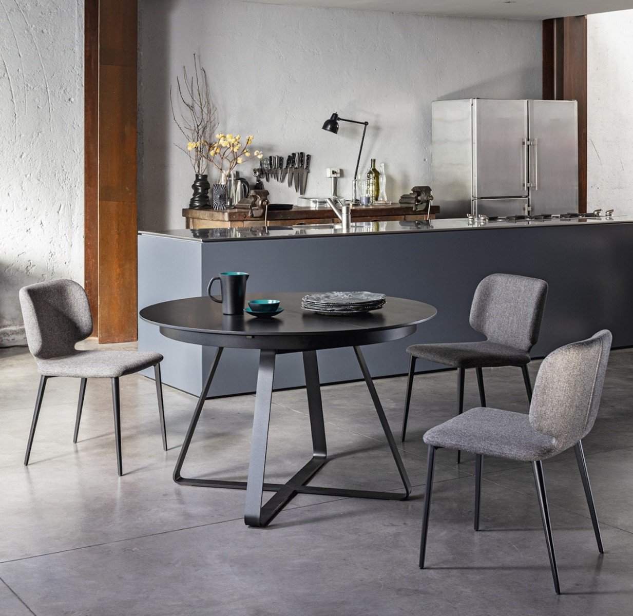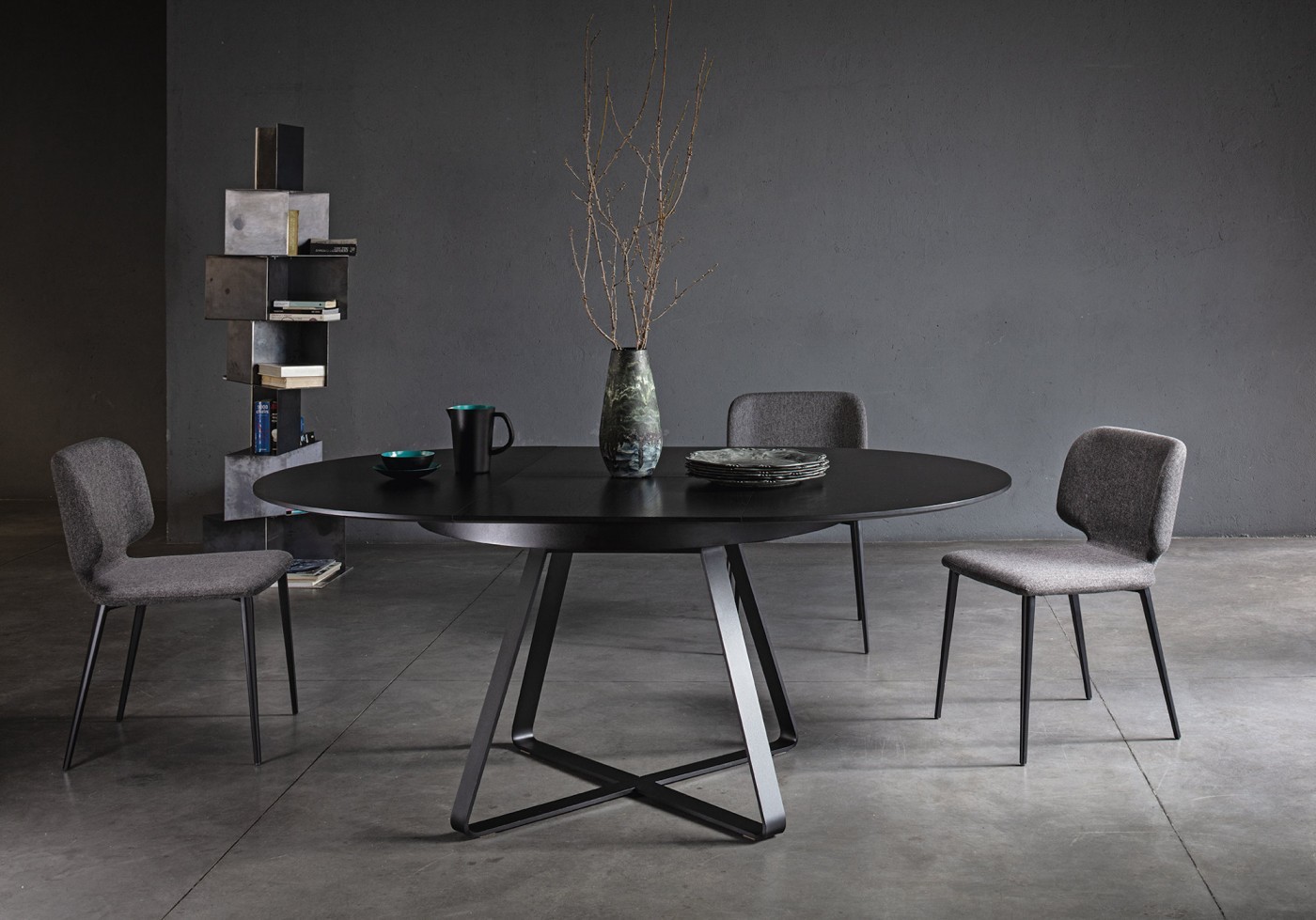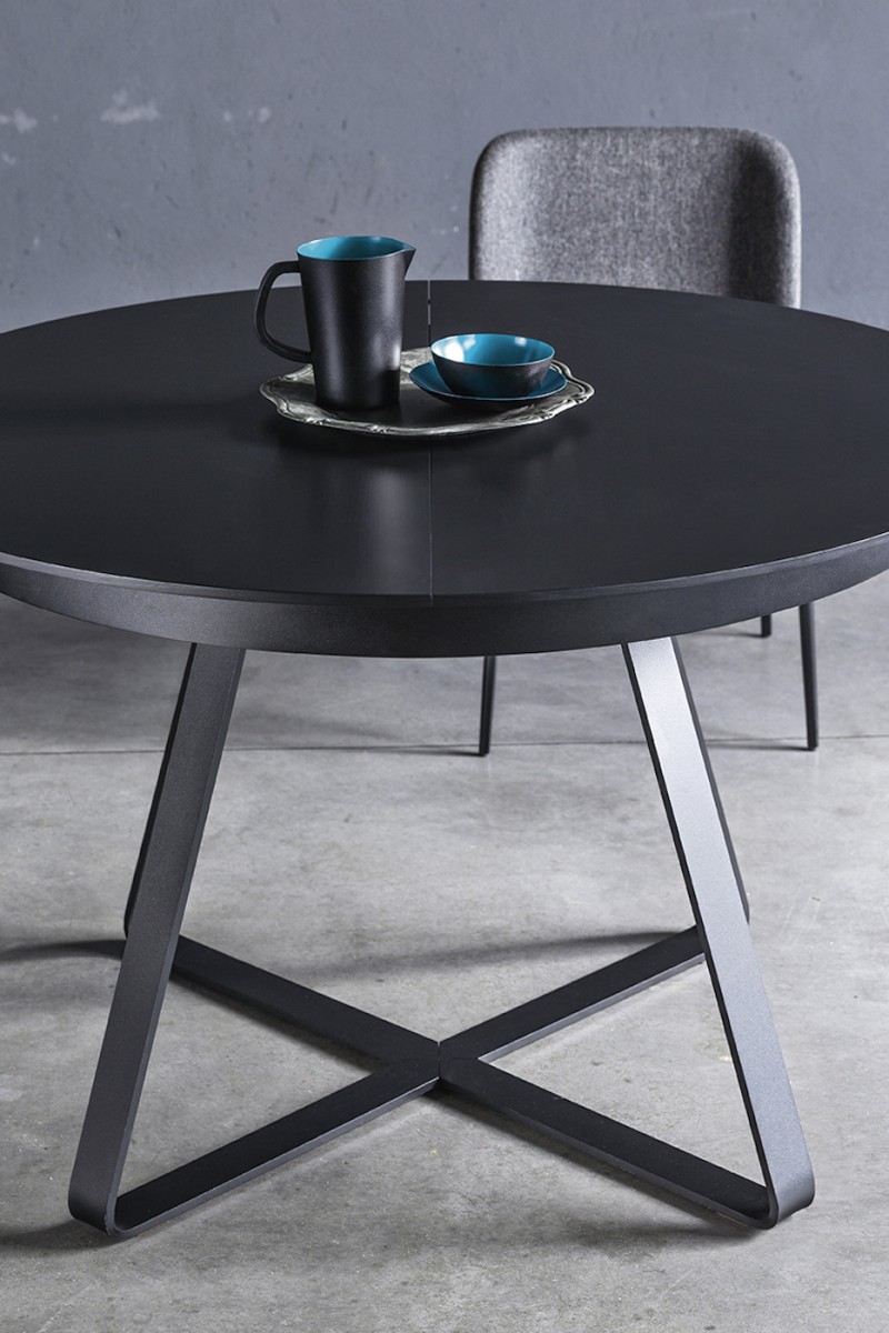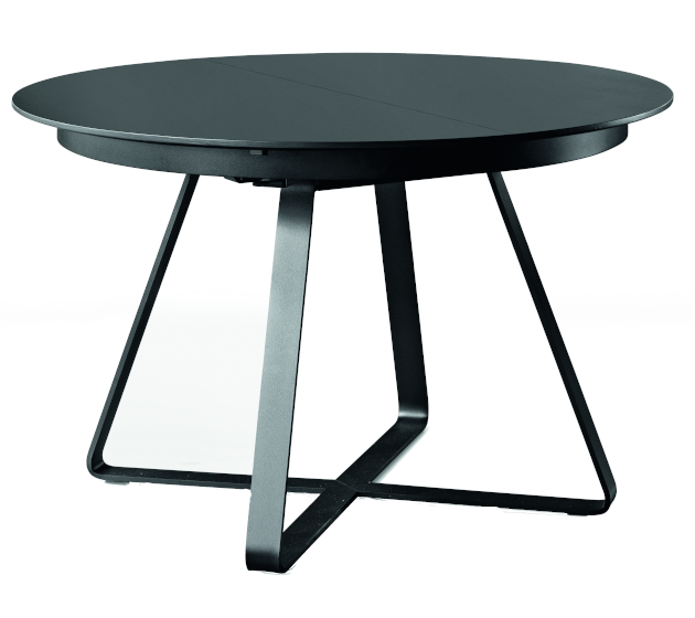 Extendable table with steel base. Wooden or crystalceramic top, matching extensions.