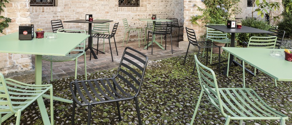 Bistrot base with four-ways steel base suitable for outdoor use.