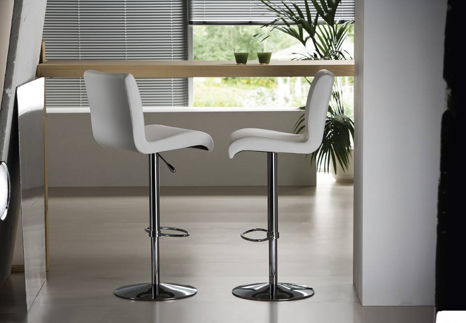 Swivel and high-adjustable stool. Available with chrome structure and seat upholstered in leather, ecoleather, fabric or custom’s fabric.