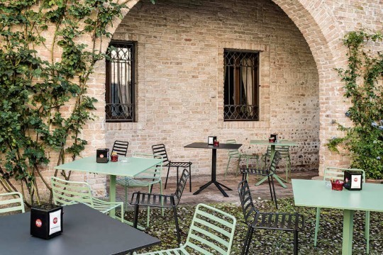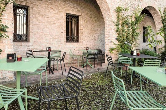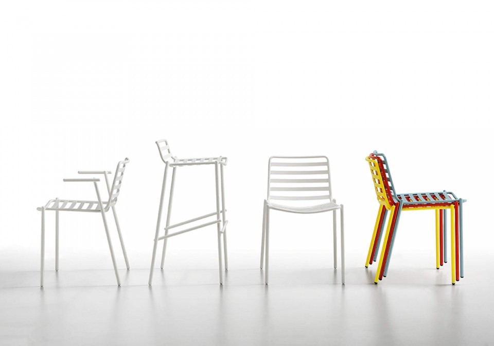 Trampoliere stackable chair with four legs base in lacquered steel. Suitable for outdoor use.