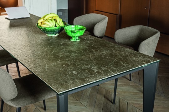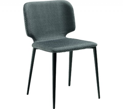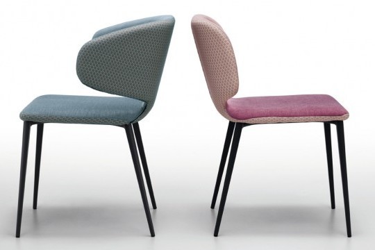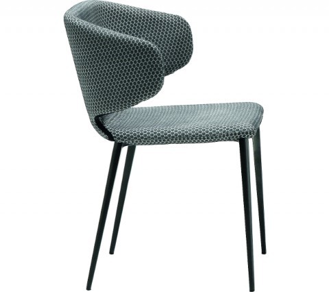 Armchair with four legs base in wood or lacquered steel. Shell upholstered in fabric, leather or faux leather with possibility to upholster front and back face in contrasting materials or shades.