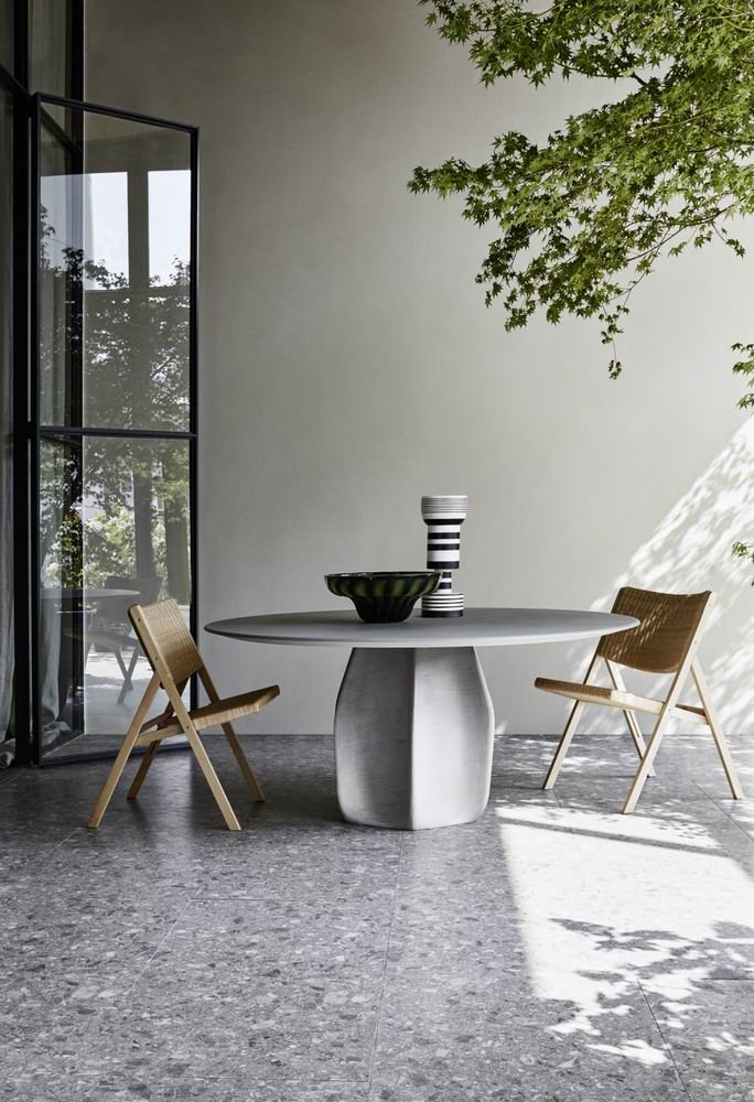 Asterias, a cactus that grows in the mountainous regions of Mexico, lends its name to this new design from Patricia Urquiola. A generously-sized round table, featuring a central base reminiscent of the cactus from which it takes its name. It consists of six curved, wedge-shaped, wooden panels, applied protruding over the central plinth. The panels are 3D printed. The top (160 or 180 cm) features a rounded edge sub-divided, in the wood version, into four wedges that give rise to an interesting geometric pattern. The table can also be fitted with a practical accessory: a central Lazy Susan turntable, very popular in Asian countries.