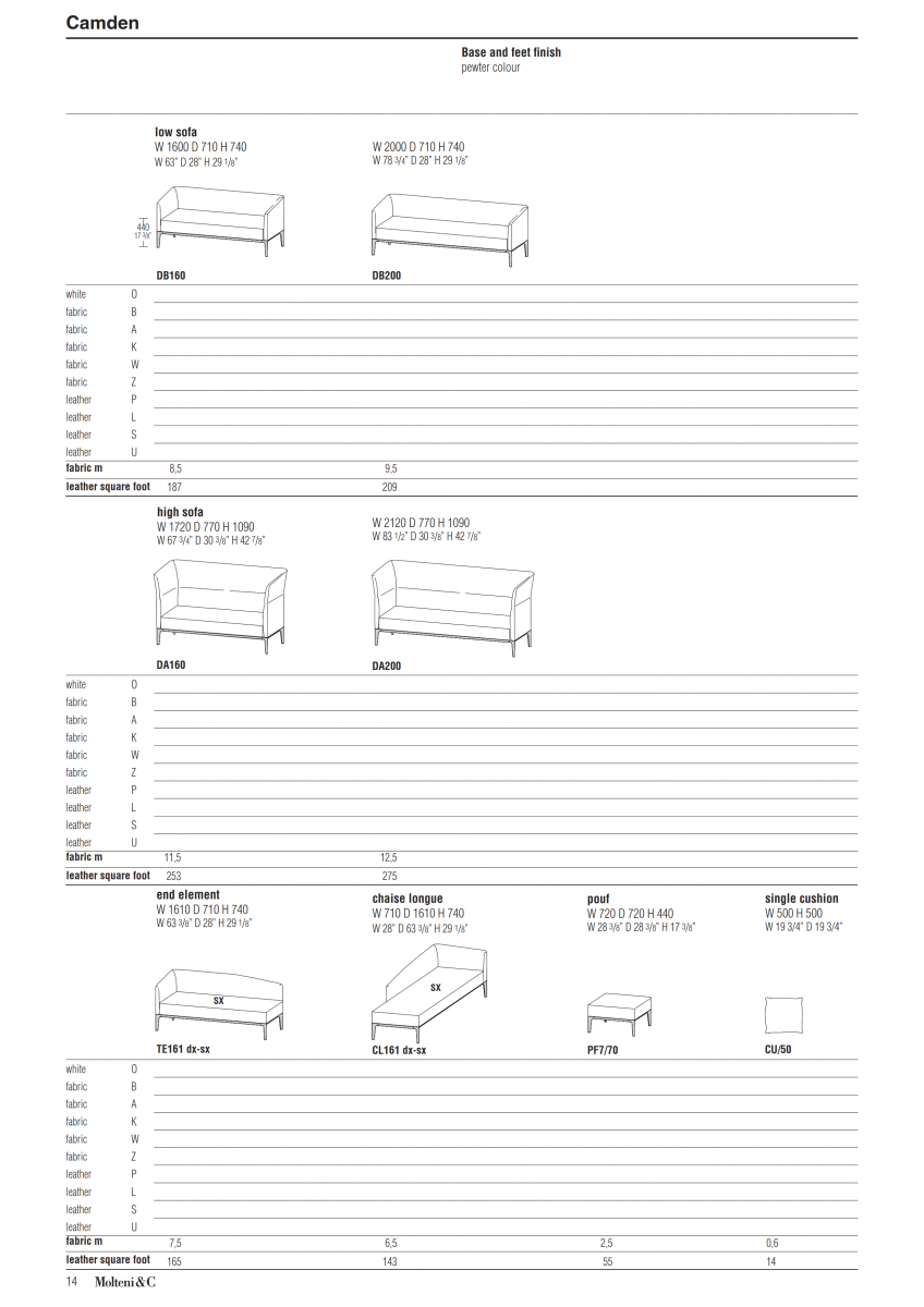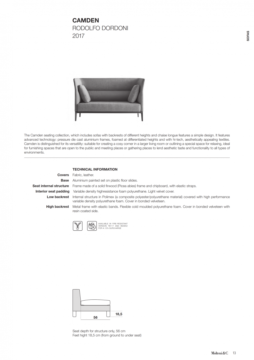 The Camden seating collection, which includes sofas with backrests of different heights and chaise longue features a simple design. The dimensions are suitable for public spaces and there is a wide range of finishes mid way between home and contract. It features advanced technology: pressure die cast aluminium frames, foamed at differentiated heights and with hi-tech, aesthetically appealing textiles.
