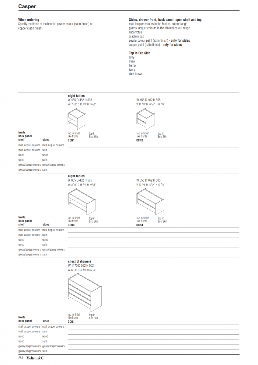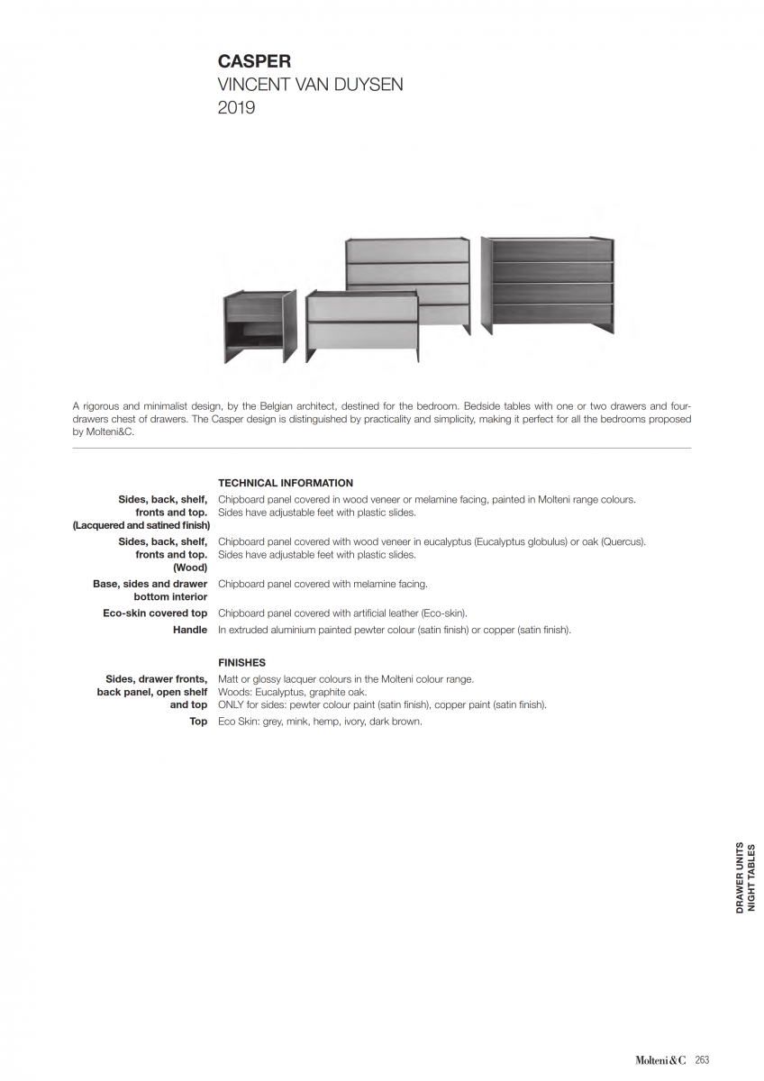A rigorous and minimalist design, by the Belgian architect, destined for the bedroom. Bedside table with one drawer and a two- or four-drawer chest of drawers, the frames are painted pewter or copper to be teamed with tops and drawers featuring eucalyptus and graphite oak.
