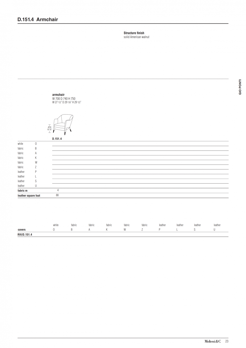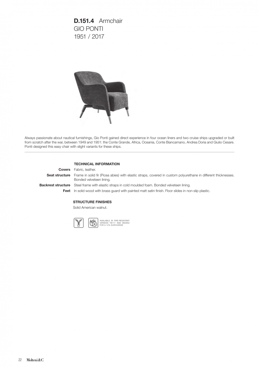 Always passionate about nautical furnishings, Gio Ponti gained direct experience in four ocean liners and two cruise ships upgraded or built from scratch after the war, between 1949 and 1951: the Conte Grande, Africa, Oceania, Conte Biancamano, Andrea Doria and Giulio Cesare. Ponti designed this easy chair with slight variants for these ships.