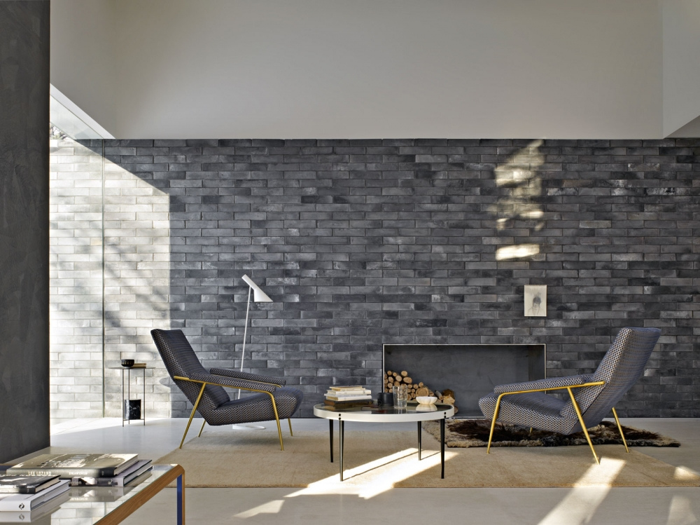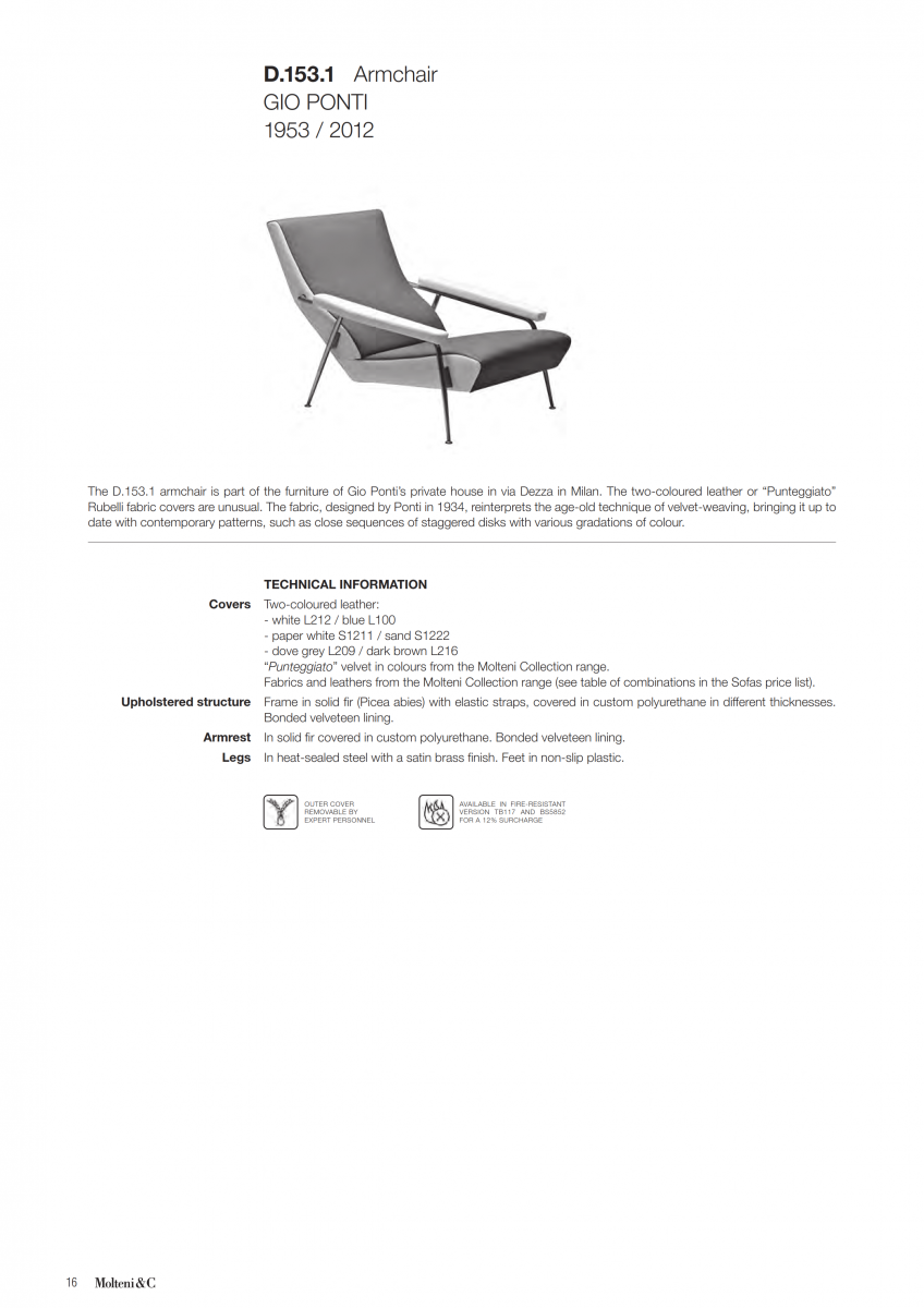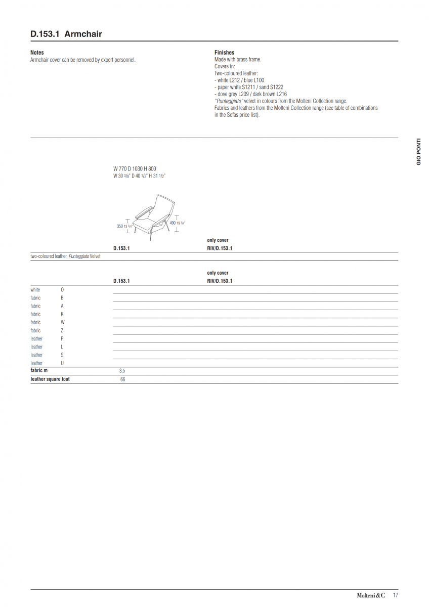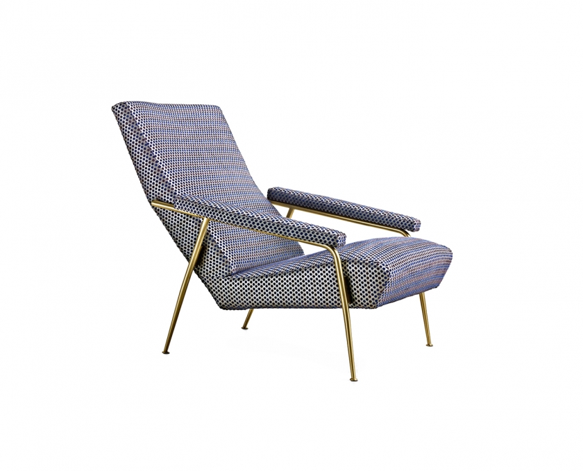 Brass structure, cover in bicolor white-blue leather or “Punteggiato” fabric, designed by Ponti for Rubelli in 1934. The fabric reinterprets the age-old technique of velvet-weaving, bringing it up to date with contemporary patterns, such as close sequences of staggered disks with various gradations of colour. Exhibited at the Salone del Mobile 2012, the D.153.1 chair enriches the Gio Ponti furnishing Collection.