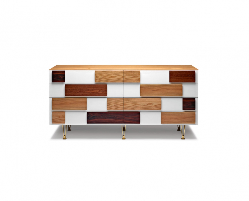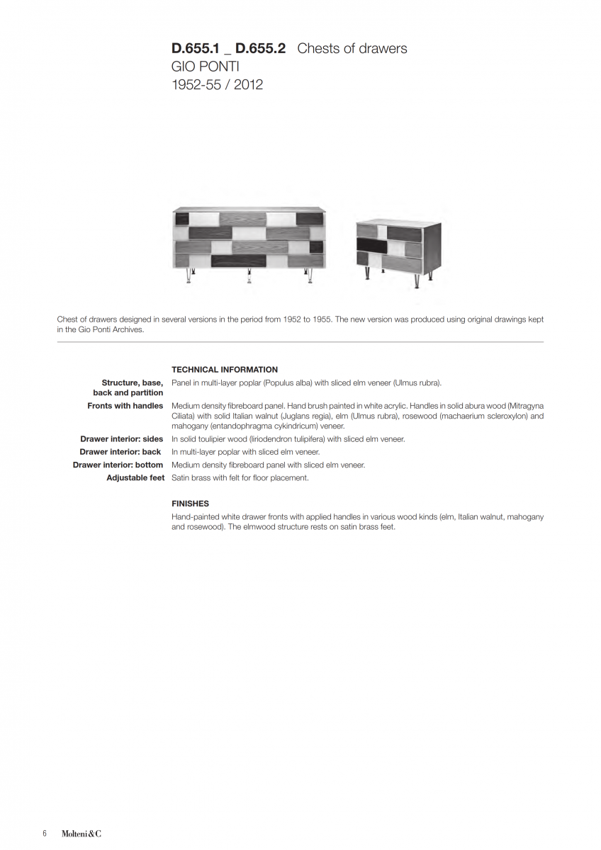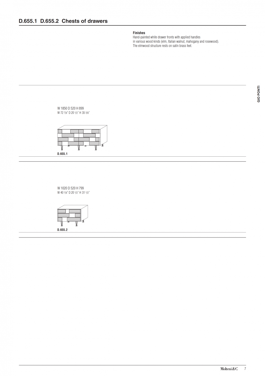 Marked by hand-painted white drawer fronts with applied handles in various wood kinds (elm, Italian walnut, mahogany and rosewood). Chest of drawers designed in several versions in the period from 1952 to 1955. The new version was produced using original drawings kept in the Gio Ponti Archives and the art direction for the Gio Ponti Collection came from Studio Cerri & Associati.The elmwood frame rests on satin brass feet.