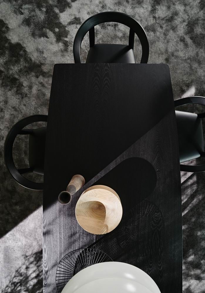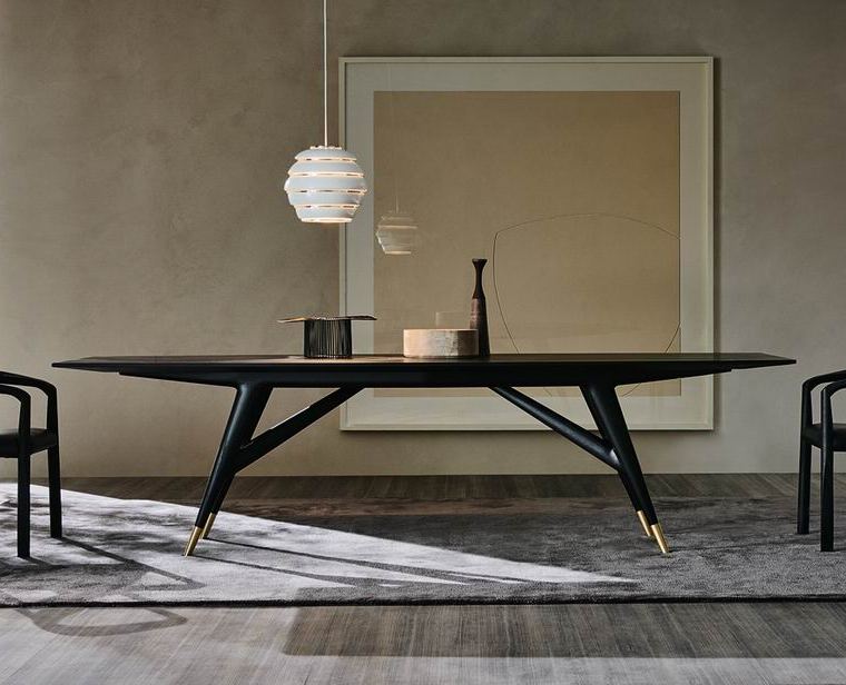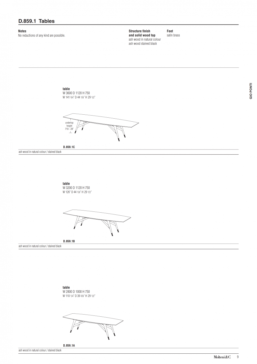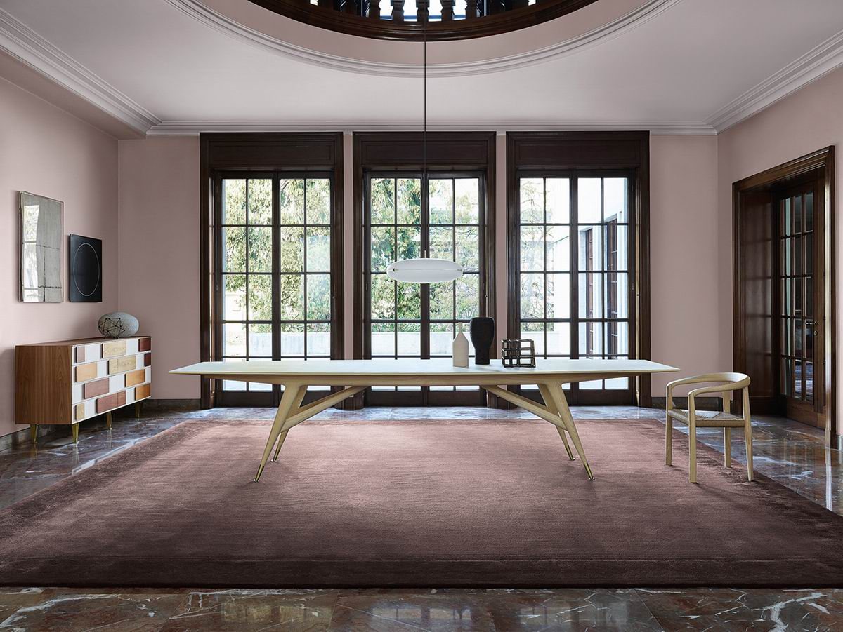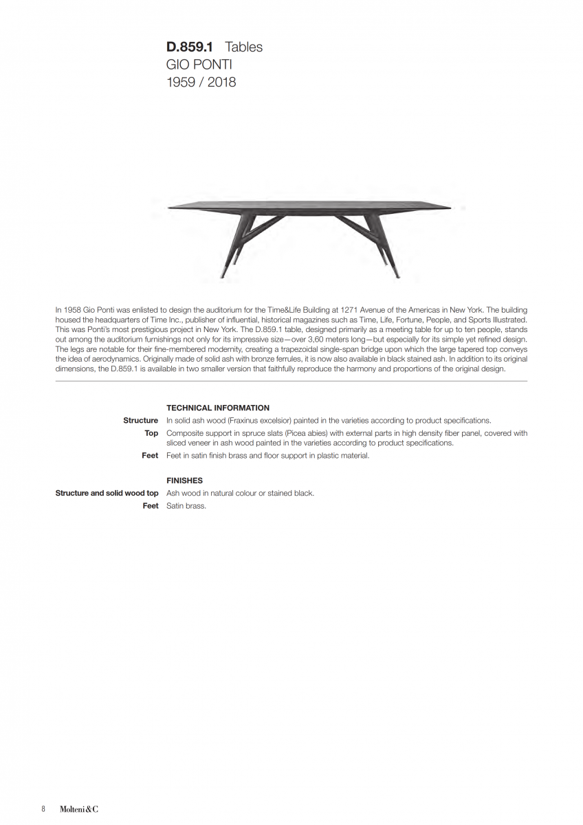 The D.859.1 table, designed primarily as a meeting table for up to ten people, stands out not only for its impressive size—over 3,60 meters long—but especially for its simple yet refined design. The legs are notable for their fine-membered modernity, creating a trapezoidal single-span bridge upon which the large tapered top conveys the idea of aerodynamics.