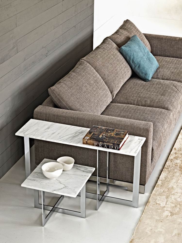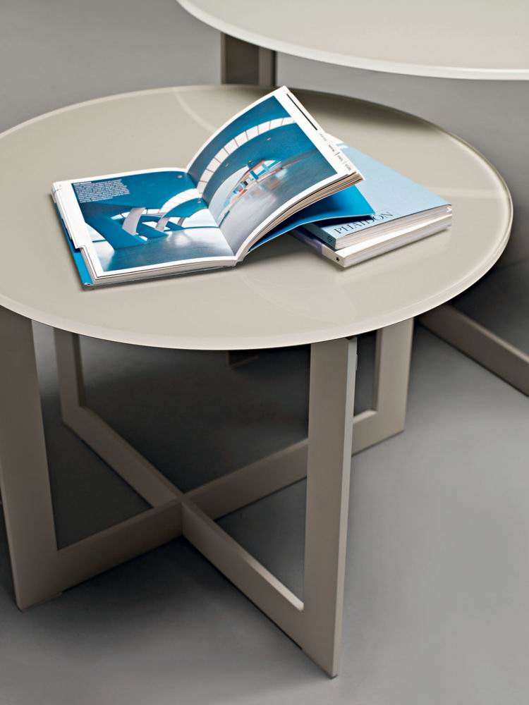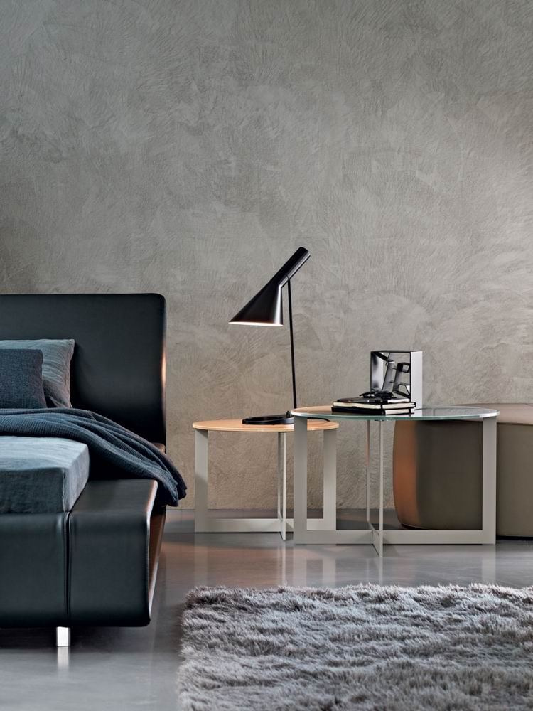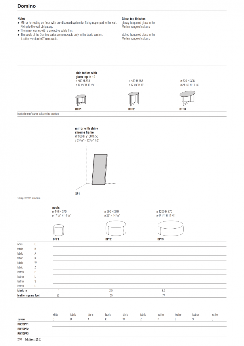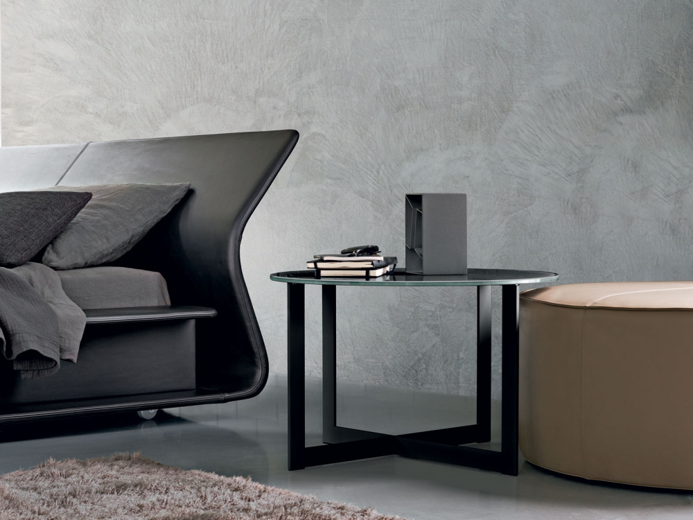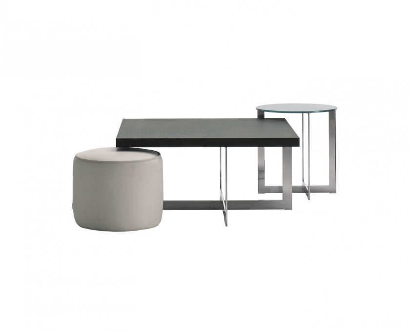A system of padded pouf and linear shelves make up a galaxy of satellites for the conversation area and bedroom areas. Designed by Nicola Gallizia to be inserted into each other, these pouf and small tables allow multiple compositions. Available in leather or fabric, with chrome metal or lacquered structures and tops of glass, marble, gres, lacquered or various types of wood. The mirror is in silverplated glass and rests on the floor and has a system to enable it to be affixed to the wall.
