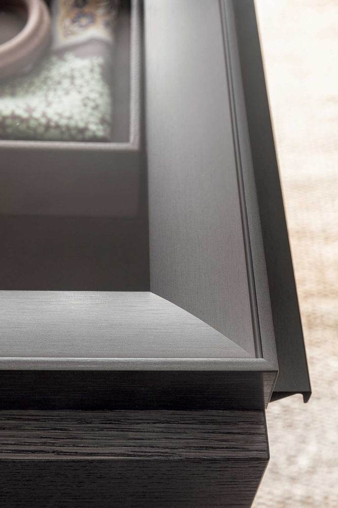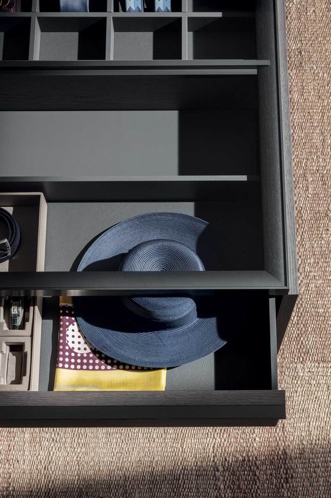 Gliss Master Island is a central island unit, a free-standing element that completes the wardrobe area of a walk-in closet or a closet area. Storage trays, drawers with clear glass fronts, and elegant shelves finished in eco skin are just some of the distinctive elements.