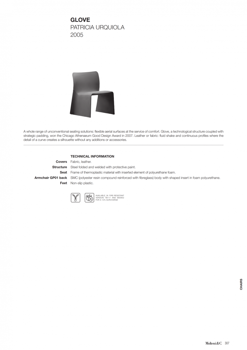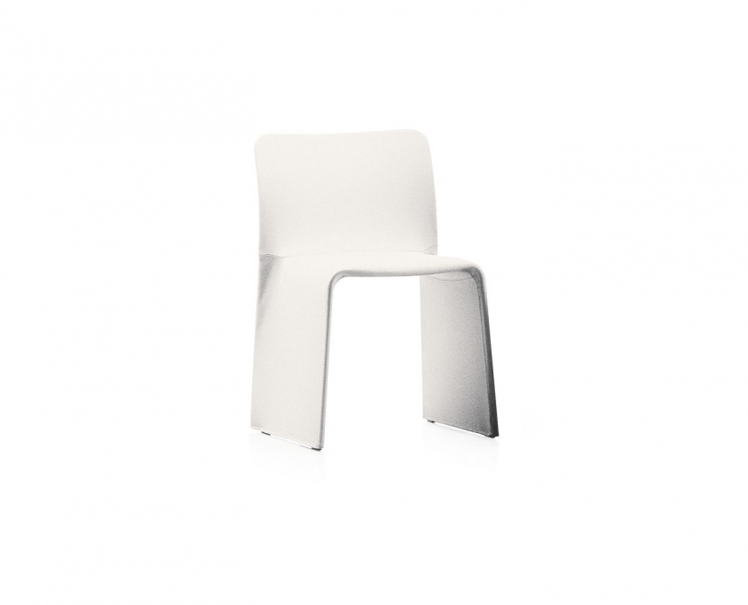 Technological structure with built-in padding is held taut by a light metal structure. This idea has produced a whole range of unconventional seating solutions, chair, chair with arms and armchair: flexible aerial surfaces at the service of comfort. Glove, a technological structure coupled with strategic padding, won the Chicago Athenaeum Good Design Award in 2007. Leather or fabric: fluid shake and continuous profiles where the detail of a curve creates a silhouette without any additions or accessories. The chair is available with a plissé embroidered cover. Impeccable display of minimalism.