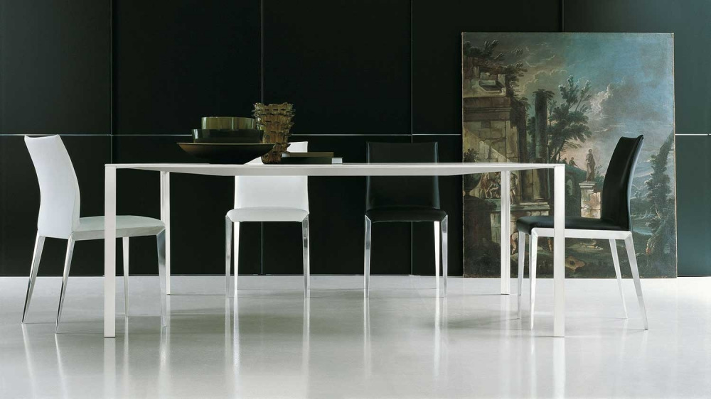 LessLess is a complete range of tables, rectangular and square, painted in different colors. An aluminum table the strength of which lies in a play on corners and folds. The external outline of the horizontal table top is very thin and stiffness and it is obtained by bending the aluminum sheet along inclined planes. Designed originally for the Fondation Cartier in Paris, the LessLess tables stand out for intrinsic elegance and light lines in every environment.