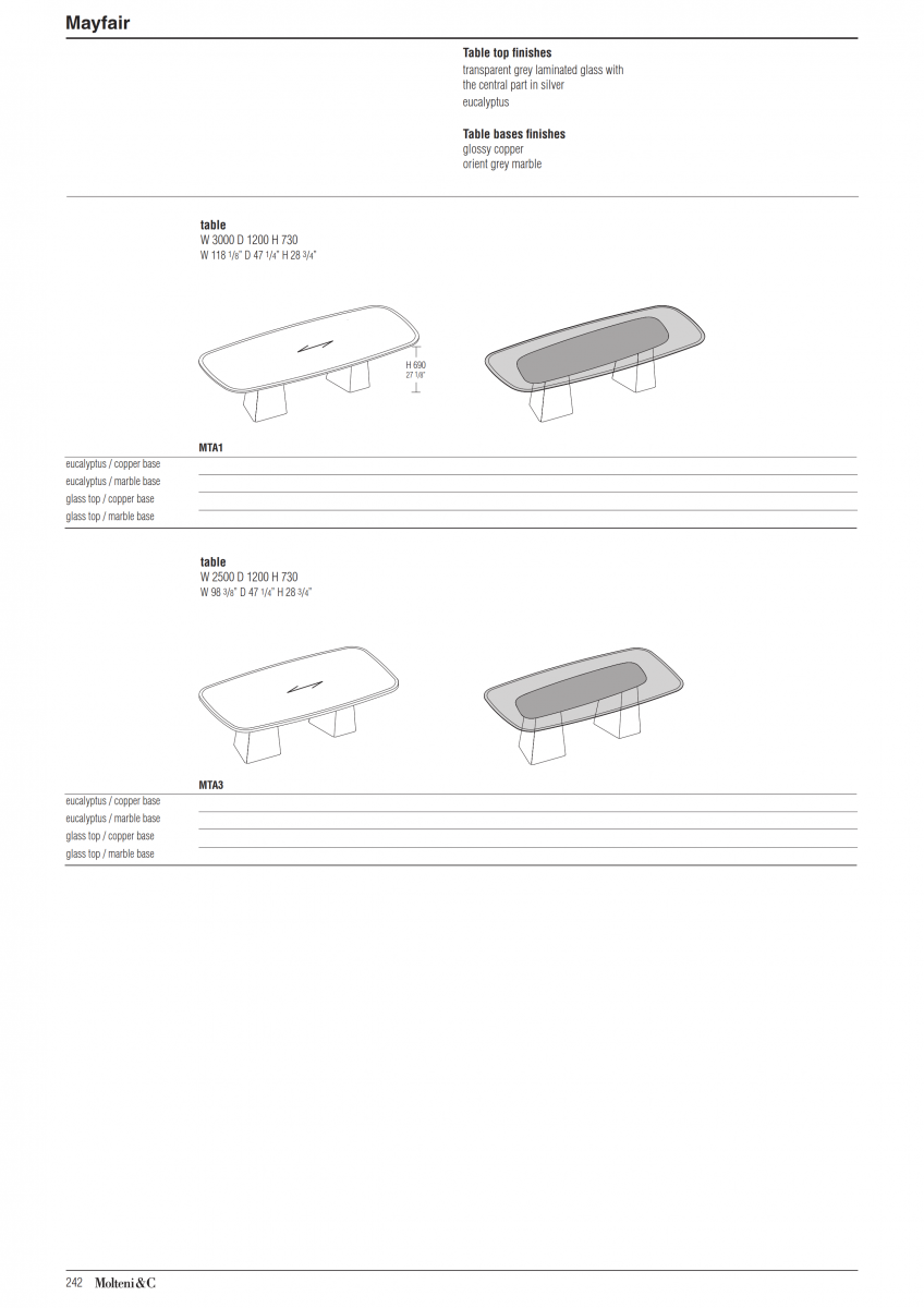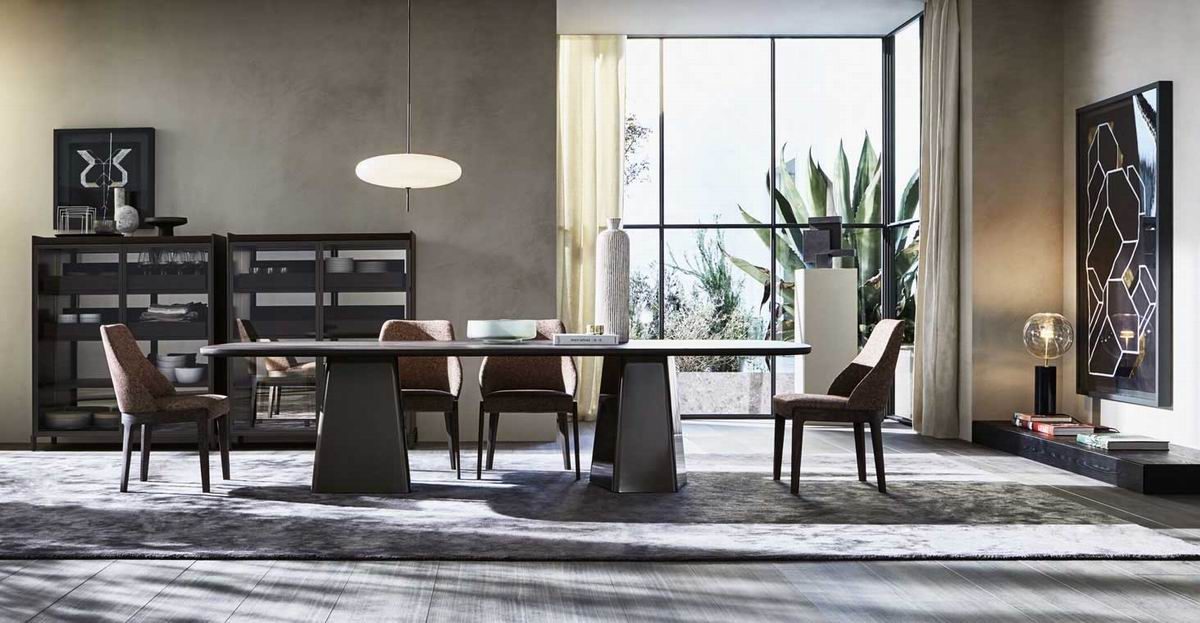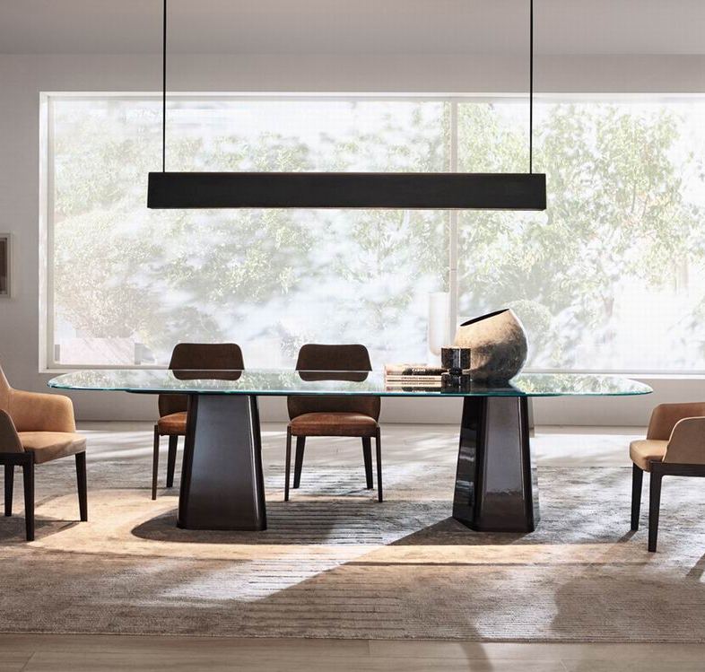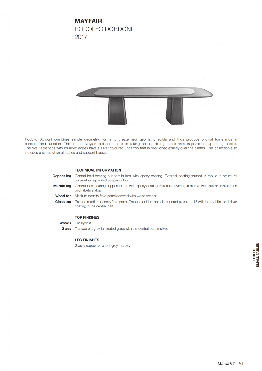 Combining geometric figures to create new geometric solids is not just an exercise for mathematicians. The most attentive designers, such as Rodolfo Dordoni, experiment with it too, giving rise to original items of furniture both in terms of conception and use. One such is the Mayfair collection, dining tables, small tables and counter tops all share trapezoidal or truncated pyramid support plinths.