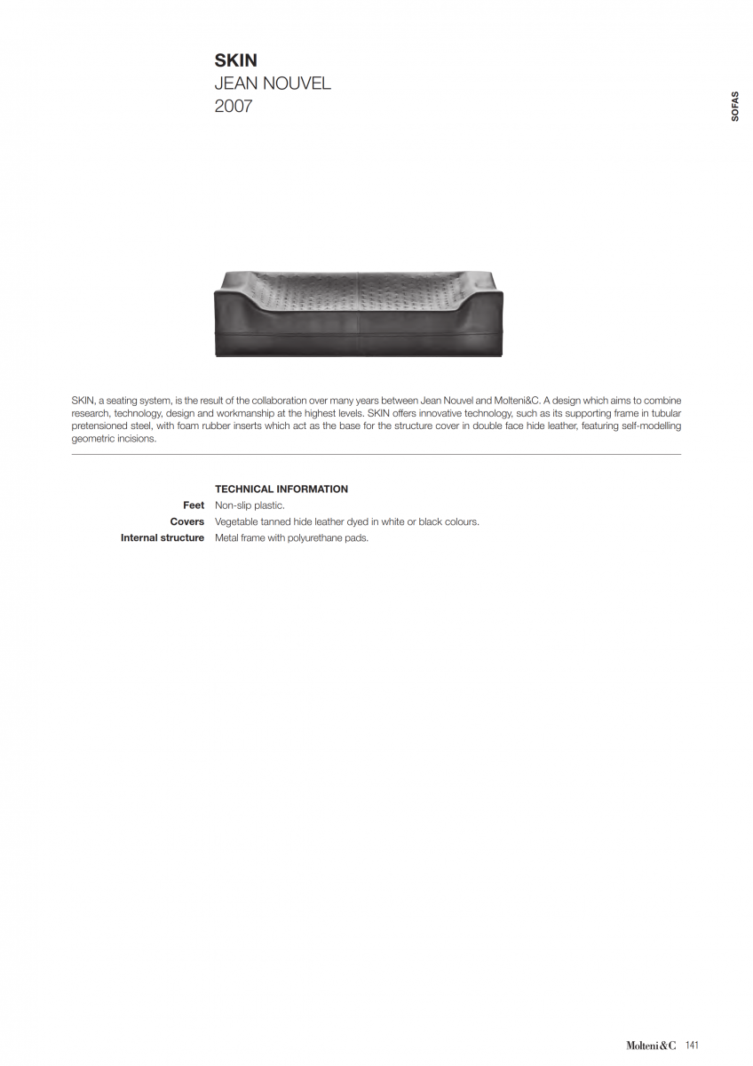 A texture crossed by light and suspended in space. The result of many years of collaboration between Jean Nouvel and Molteni&C, SKiN is a self supporting hide leather cover with a special pattern. Leather without body reshapes itself over time so that innovation and memory hold the same form.