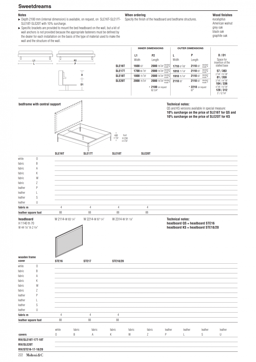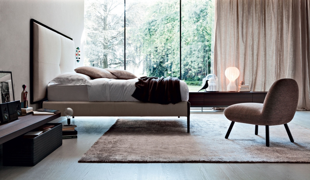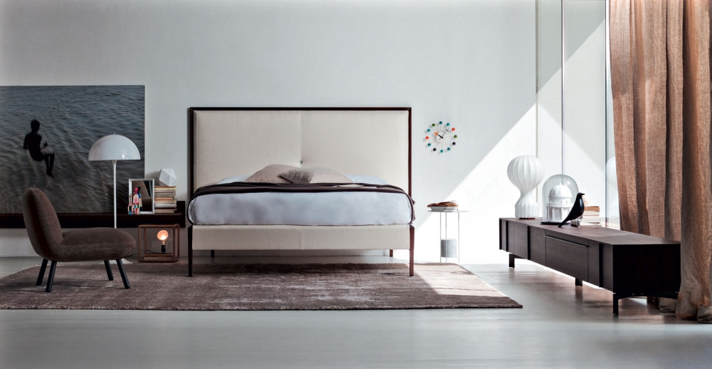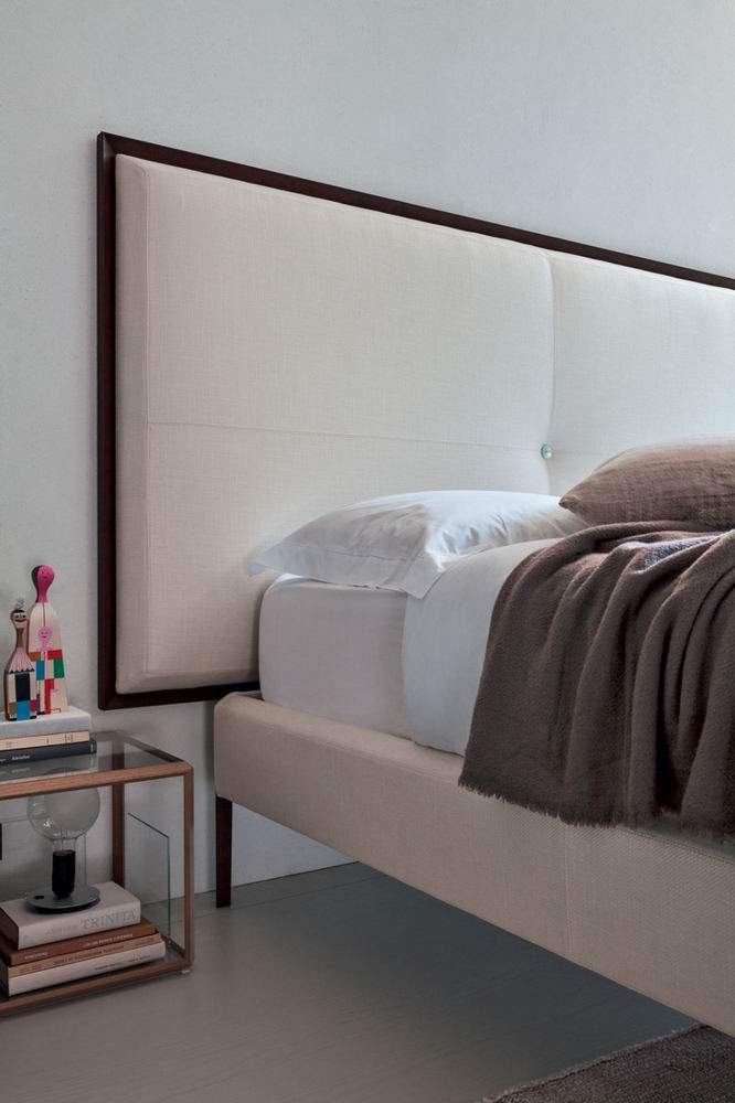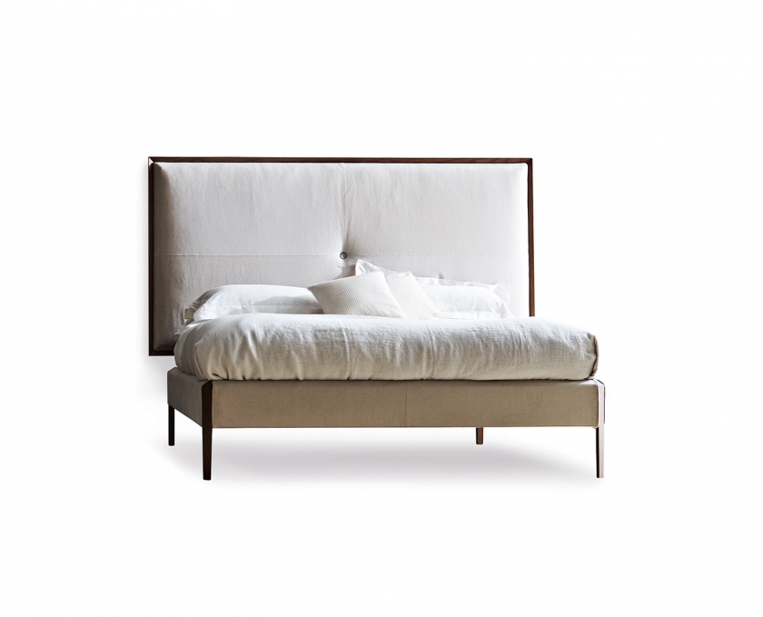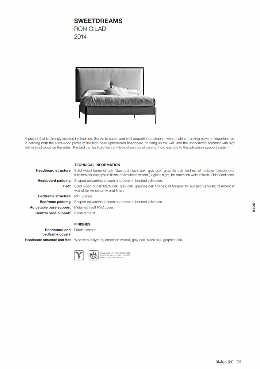 This design, featuring slender, well-proportioned forms, was deeply inspired by tradition, and the art of cabinet making played an essential role in defining the profile of the high, upholstered headboard and the bedframe supported by tall feet at the sides. The Sweetdreams bed, designed by Ron Gilad and presented last year as a multimedia installation, has joined the Molteni&C collection. Sweetdreams is an evocative design, focused on transmitting wellness deriving from tranquillity that can draw on our bodies’ relaxing, regenerating energies. A bed with a padded slatted base with solid wood legs. A padded headboard which can be fixed to the wall, framed by a solid wood profile.