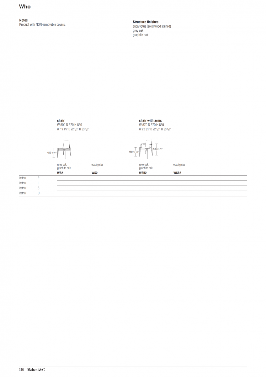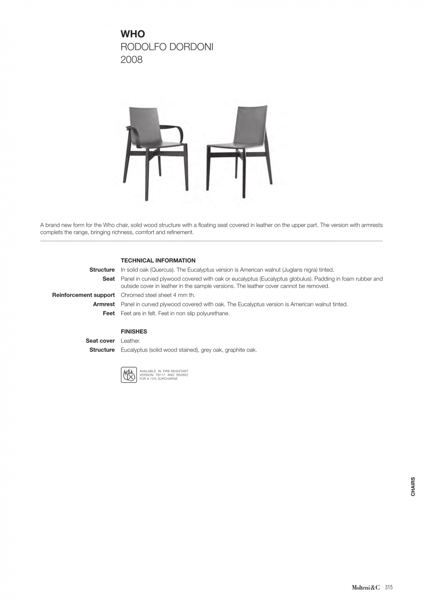 A novel shape for the Who chair, a solid wood structure that supports an ethereal seat which is leather covered on the front. The version with armrests complets the range, highlighted by rich details and the craftsmanlike manufacture.