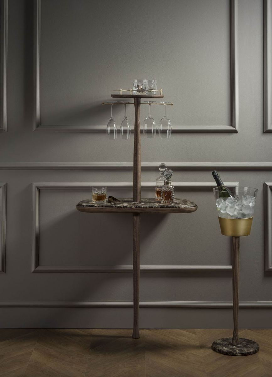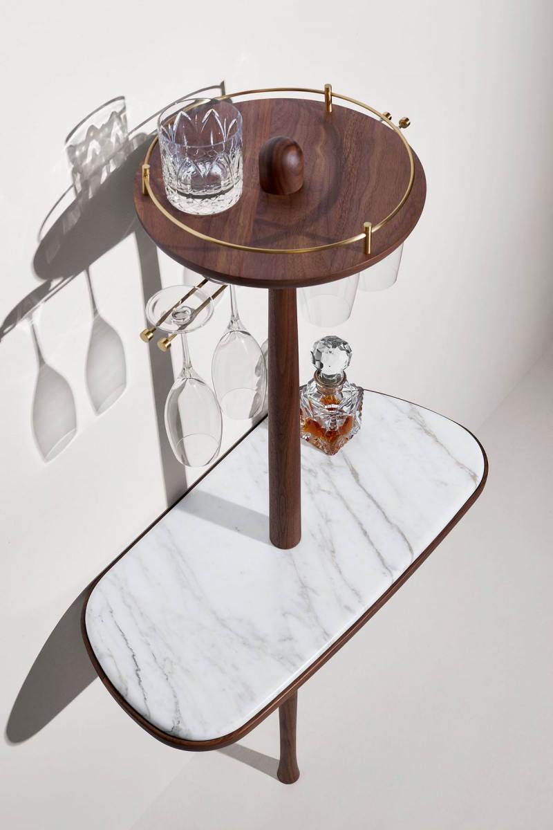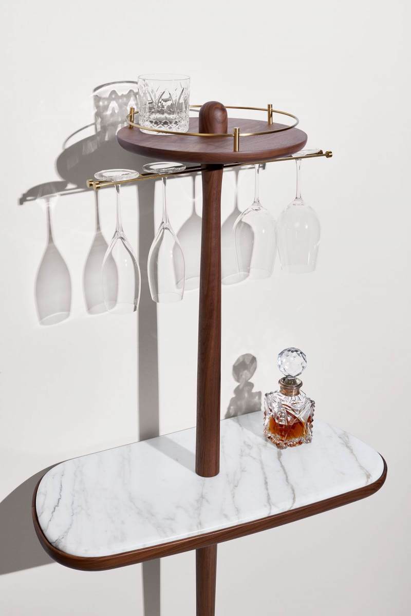 We create a space to enjoy a drink in good company. Marble top and suspended cups from the golden rods evoke classical bar cabinets.