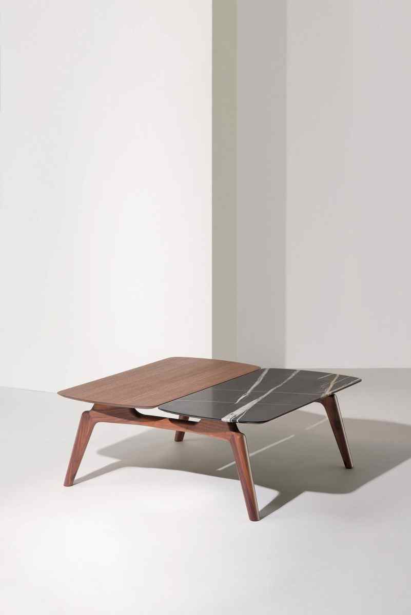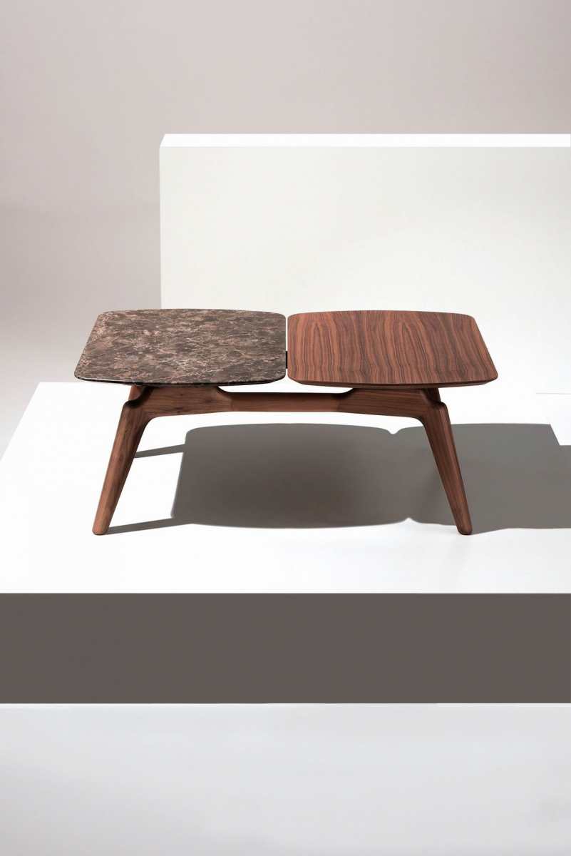 Elegant table with a strong personality and big presence which will not go unnoticed. Combines walnut with Calacatta gold, Sahara Noir or Emperador marbles.