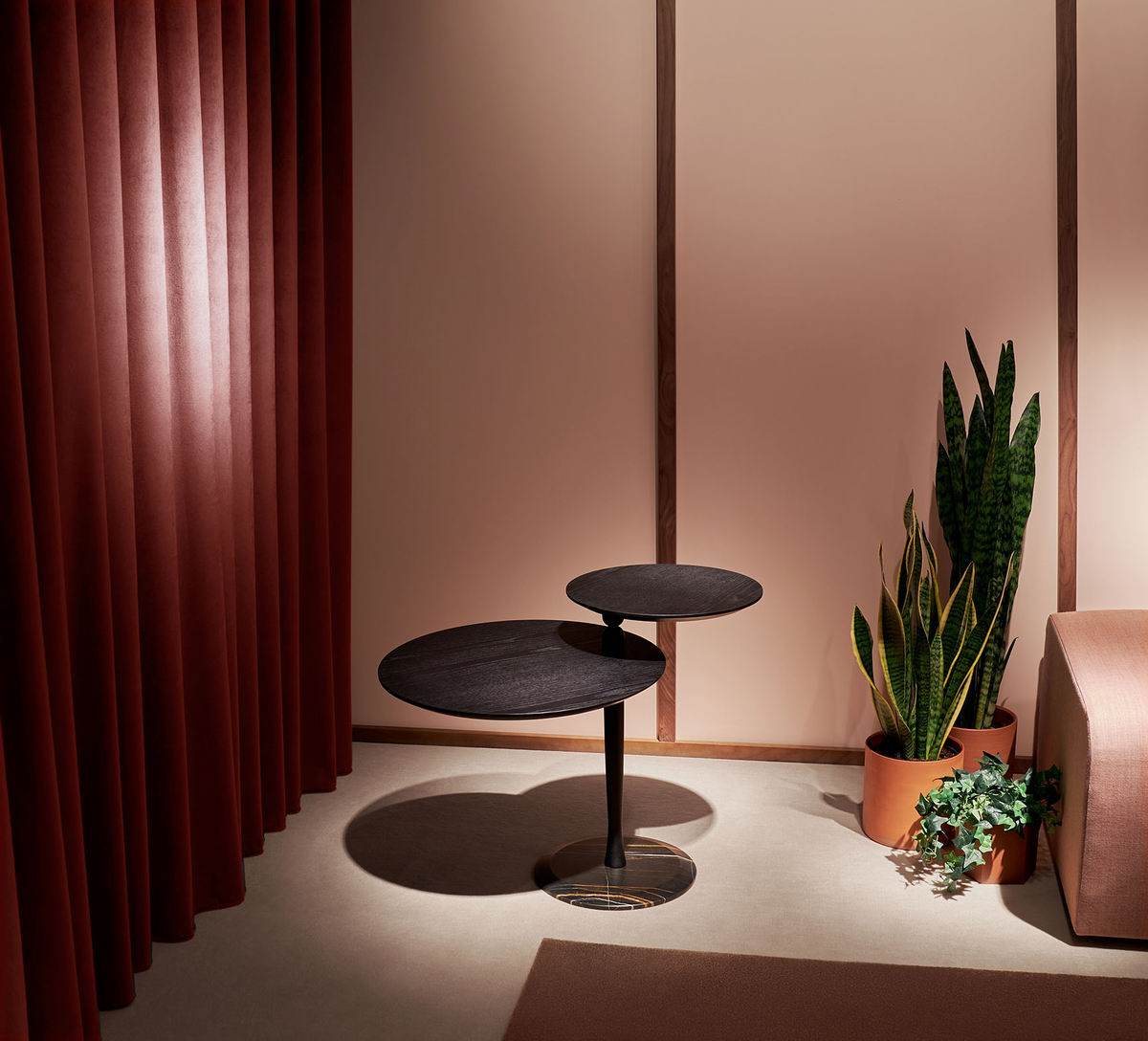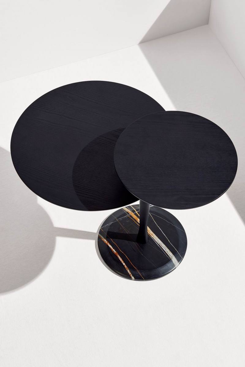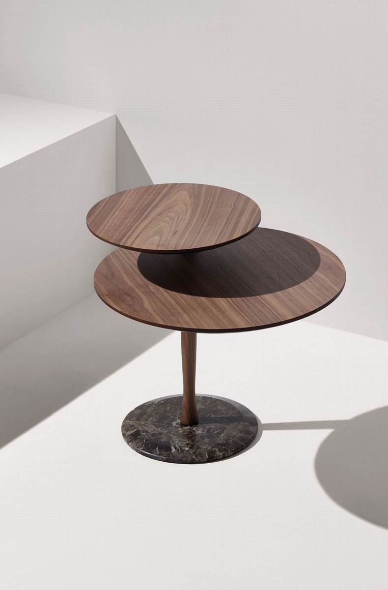 Attractive side table with a functional swivel top. Its subtle wood turning lathe holding the superior top creates a visual element with balance and lightness. The marble base contributes with prestige to the design.