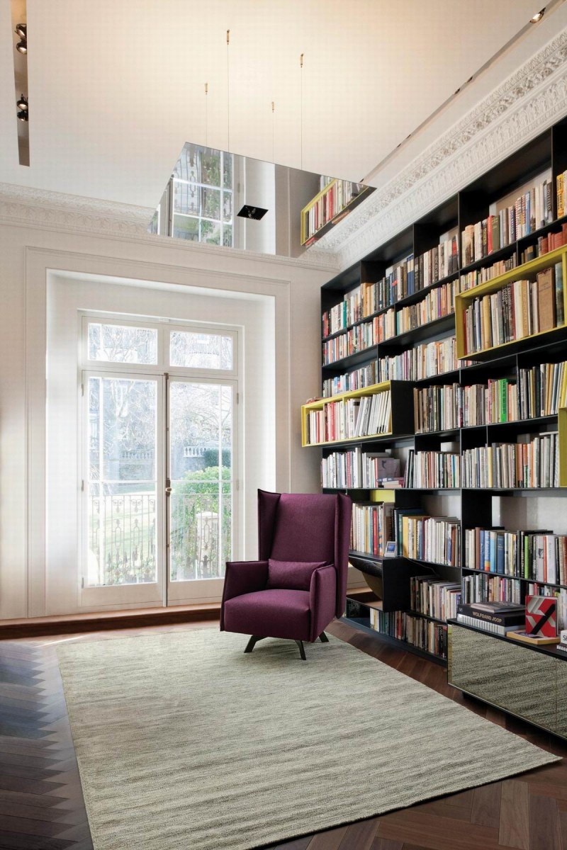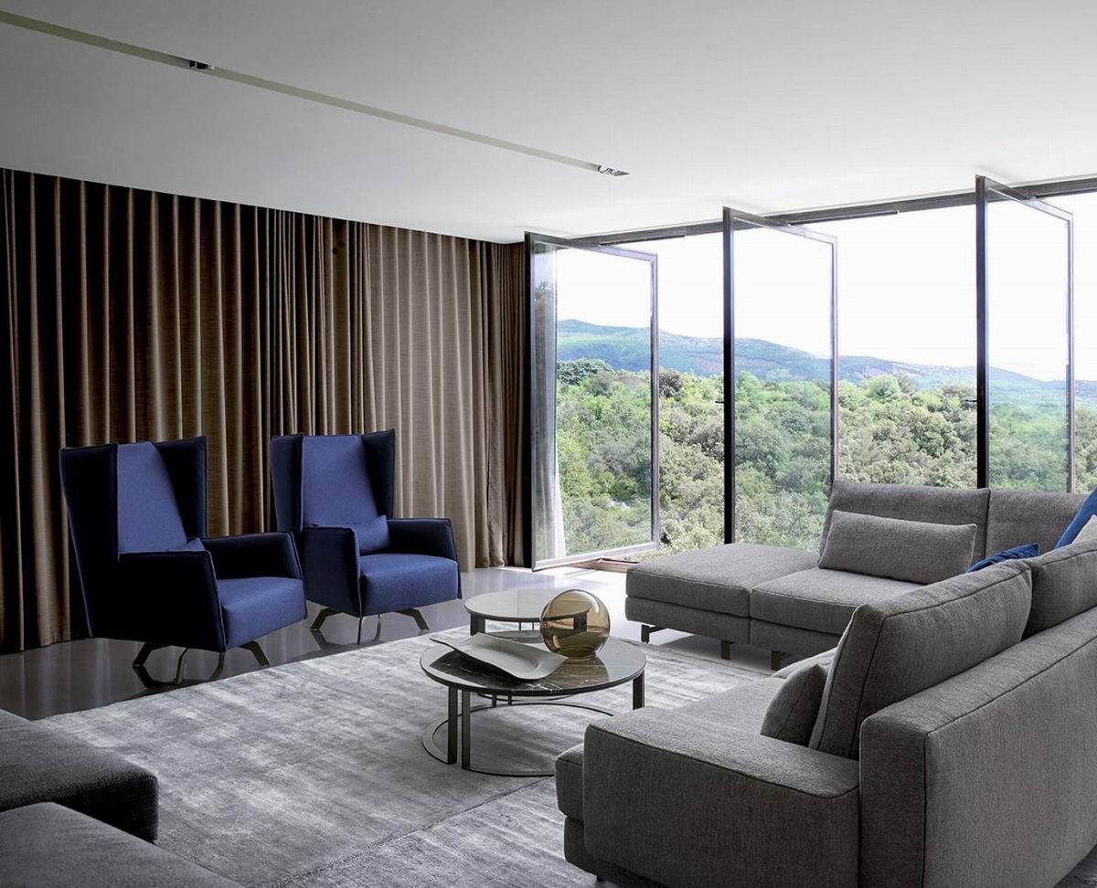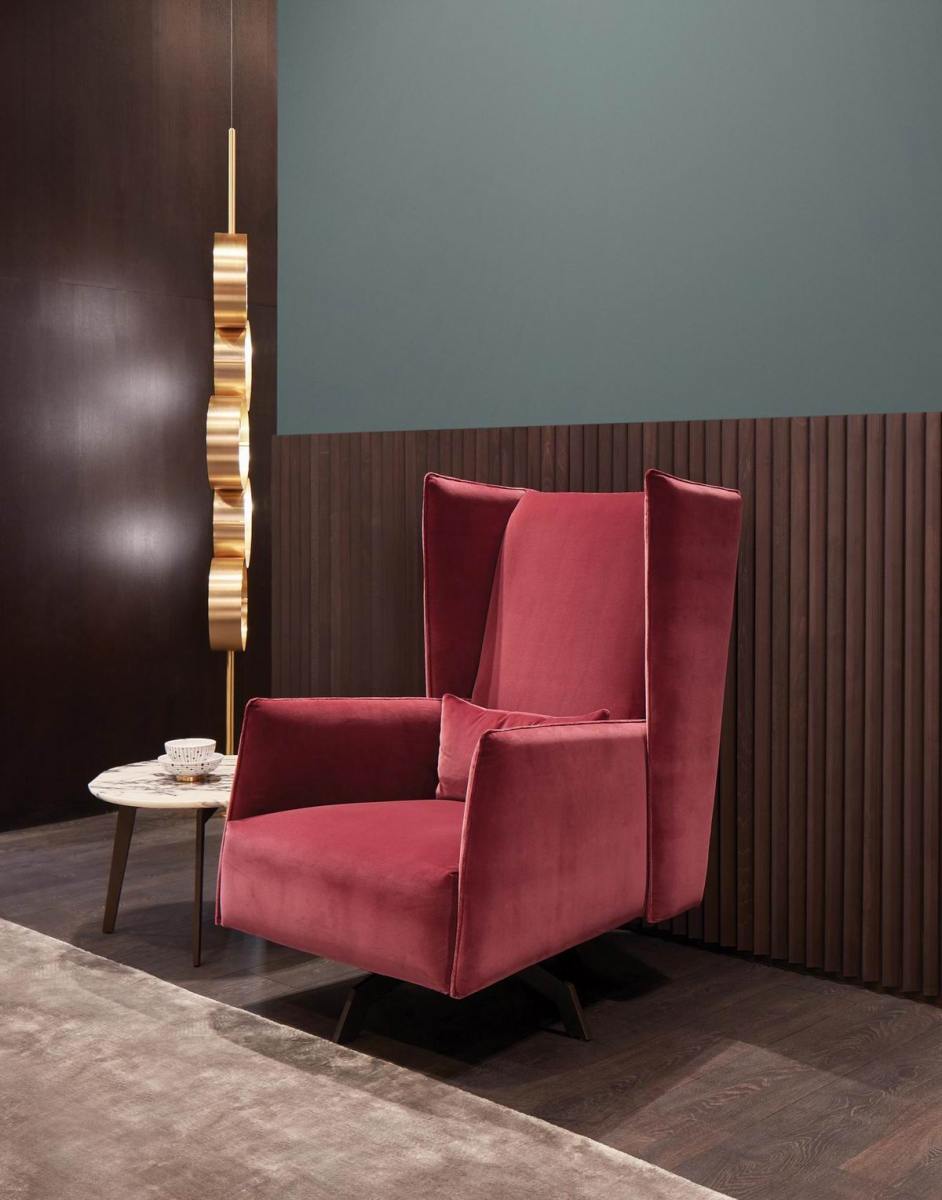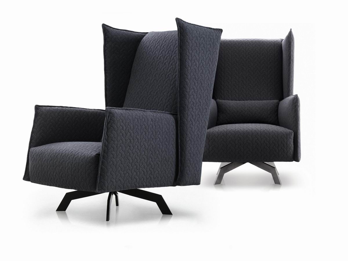 Armchair with swivel steel base painted in metal brown finish. removable fabric or leather upholstery.