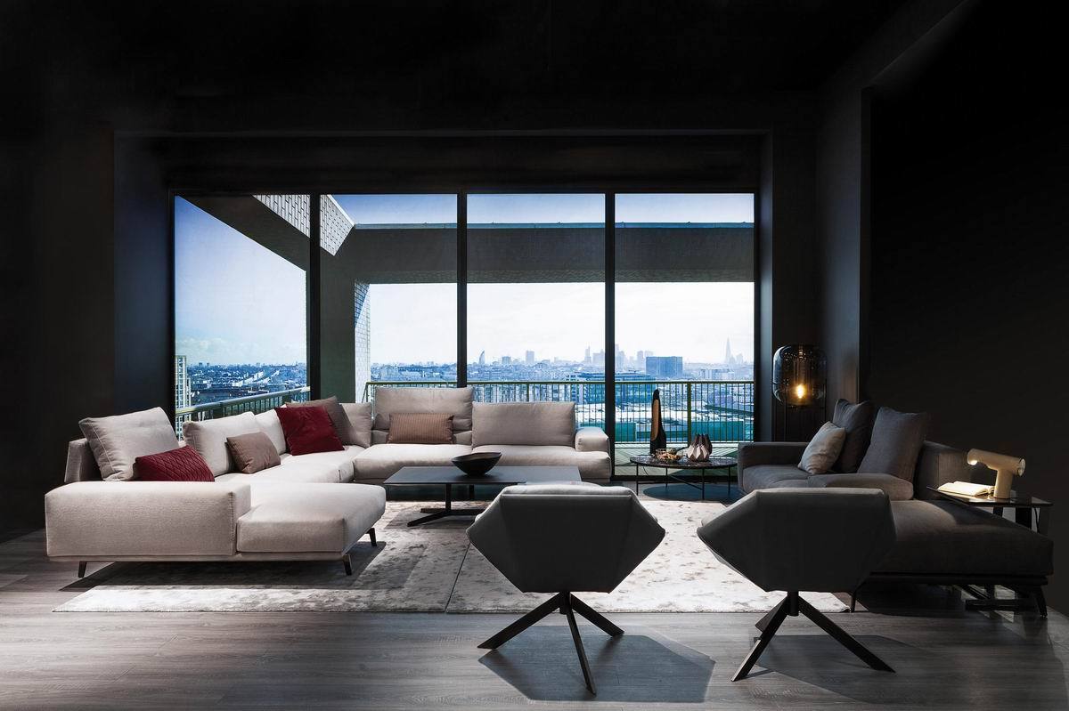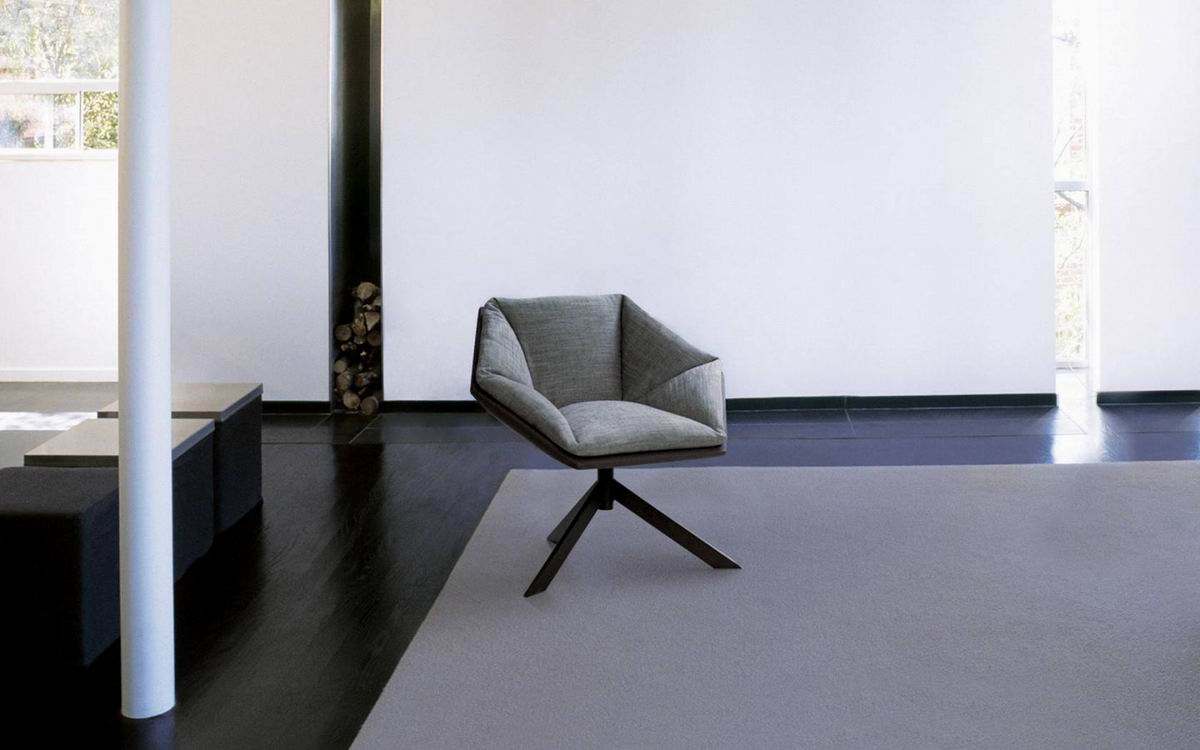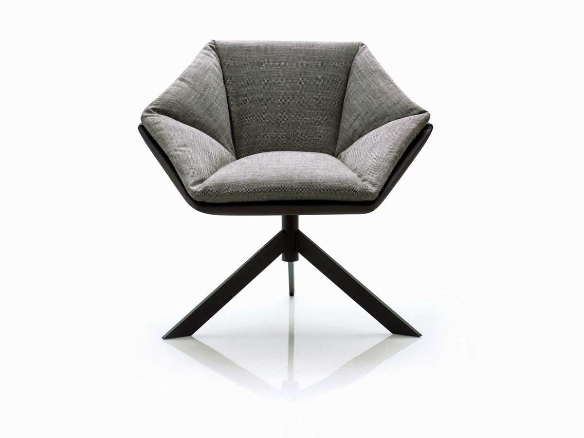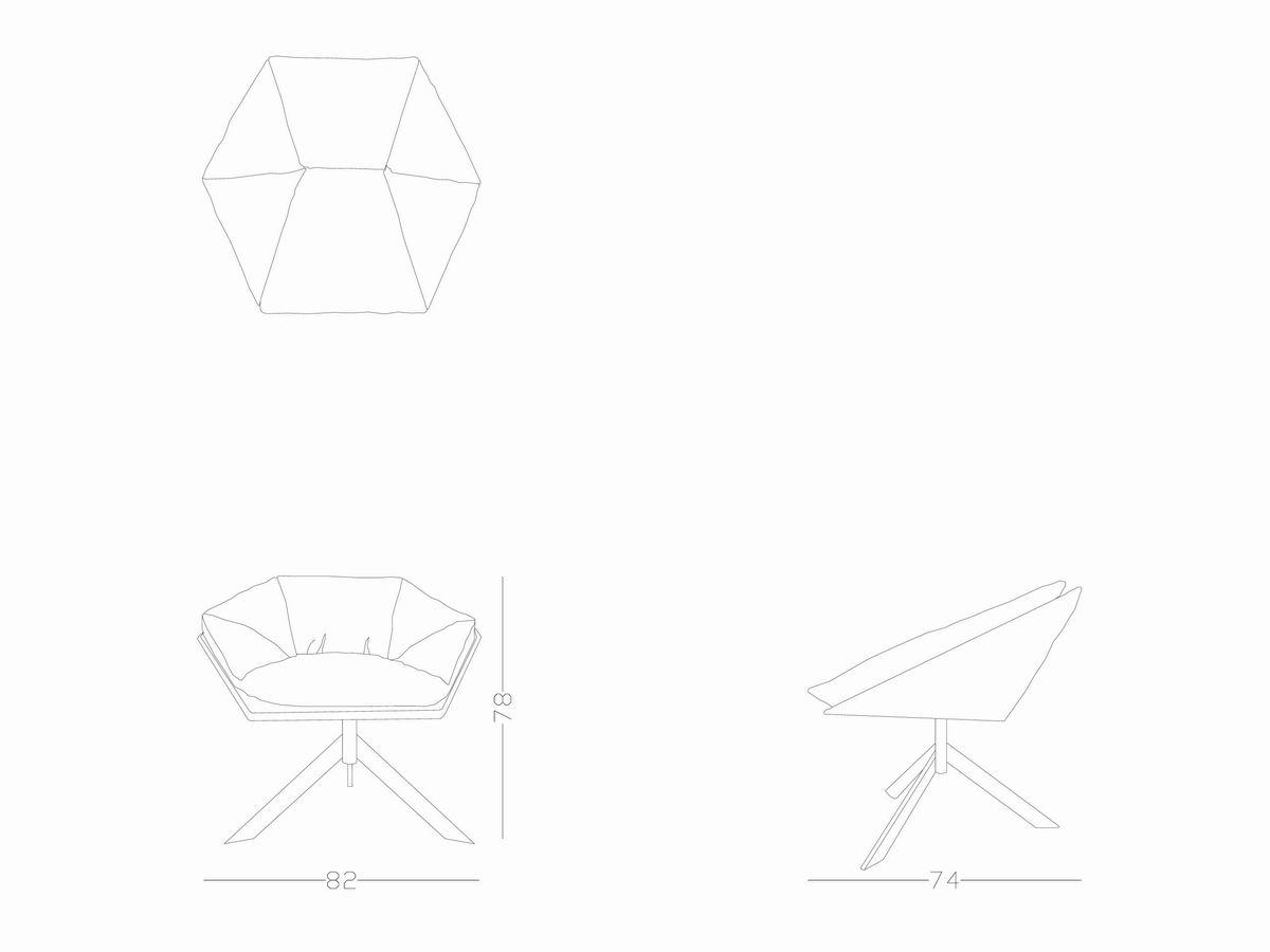 Armchair with internal steel and plywood frame. seat, backrest and armests and padded with a removable feather cushion. swivel steel base in dark brown color. removable fabric or leather upholstery. the armchair can be produced with the same fabric/lather at the base and the cushions or with a variation of two materials.