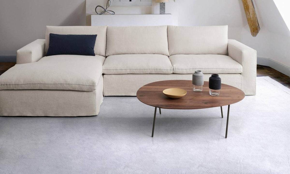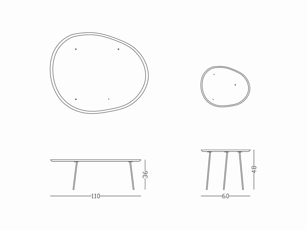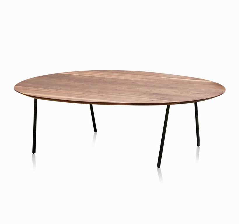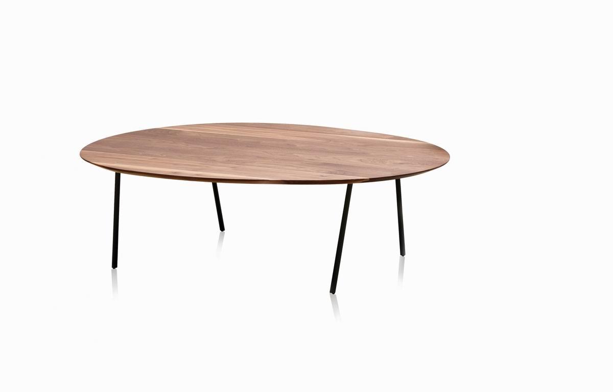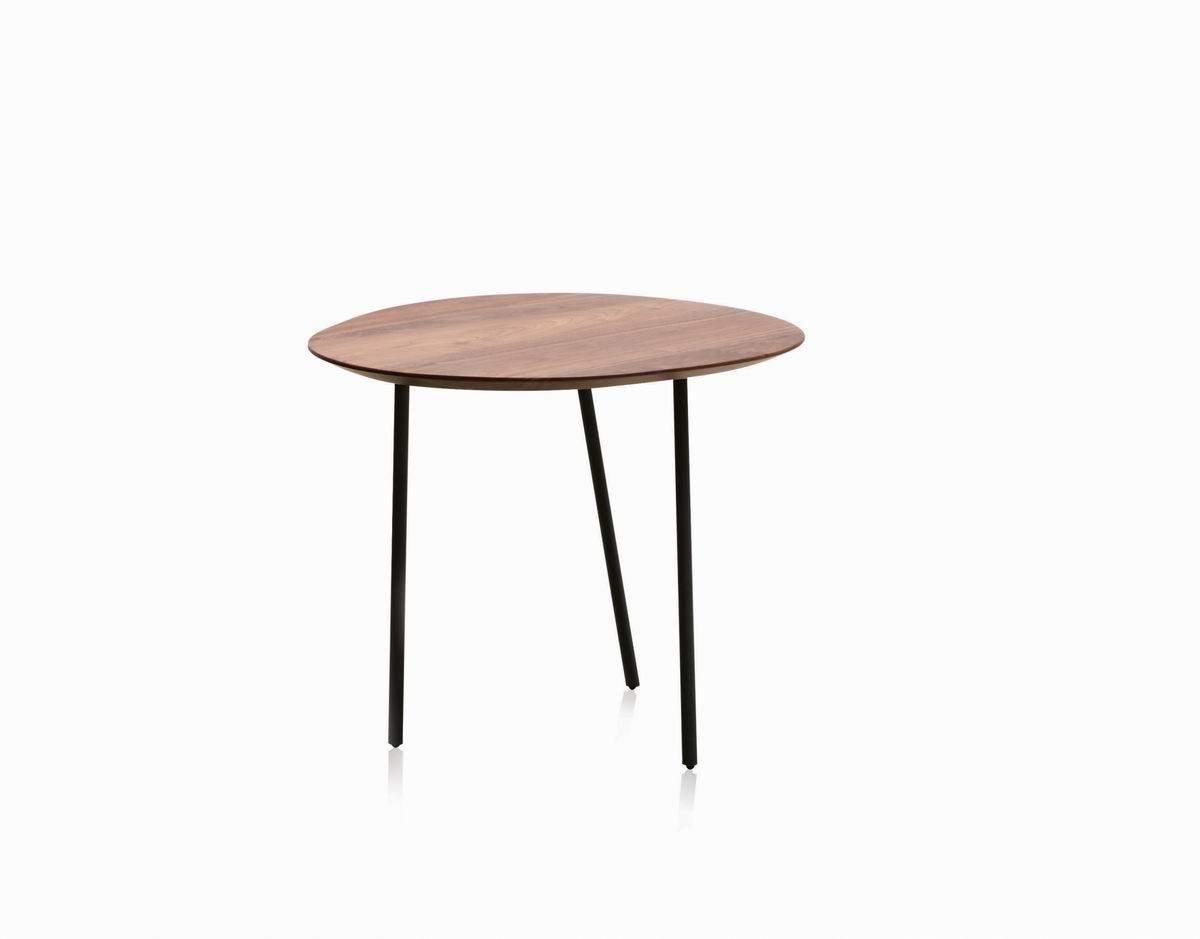 Low tables in random eclipse shape, available in two size, in solid American walnut. Steel legs in anthracite grey color.