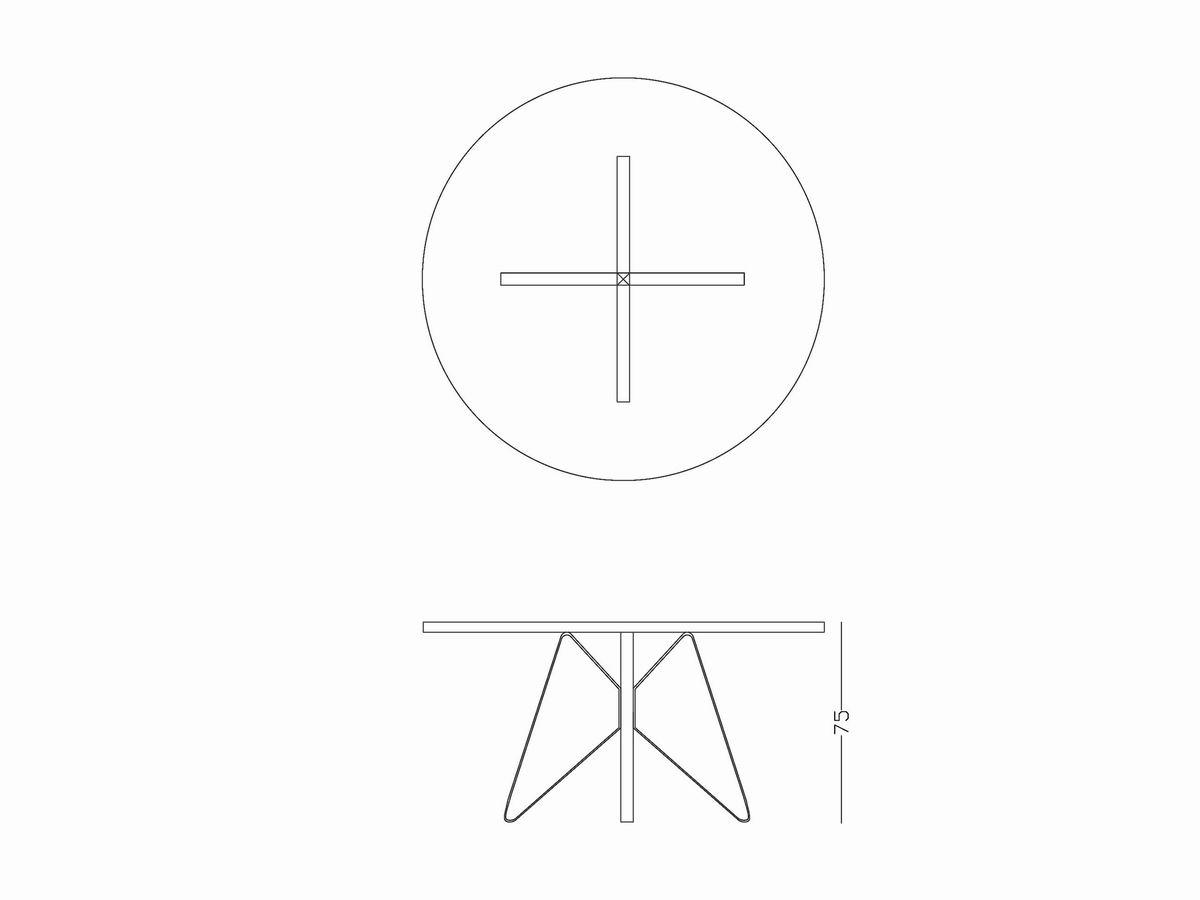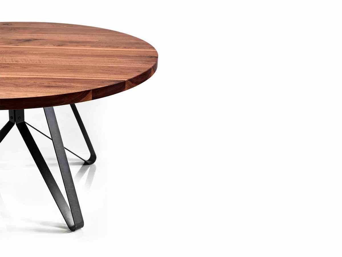 A round table with steel base in anthracite grey finish. table top in solid american wallnut, in natural matte finish.