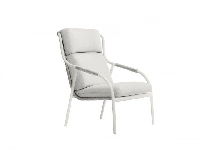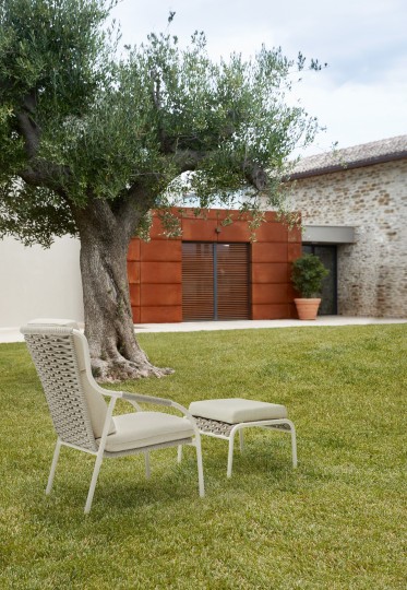 Relax armchair, aluminum frame powder coated woven with Round Searope. Ergonomics and elegance perfectly combined in this armchair with a chic style and at the same time relaxed design that invites to a pleasant contemplation. Ideal if combined with the coordinated pouf. Suitable for indoor and outdor, both in residential and contract settings.