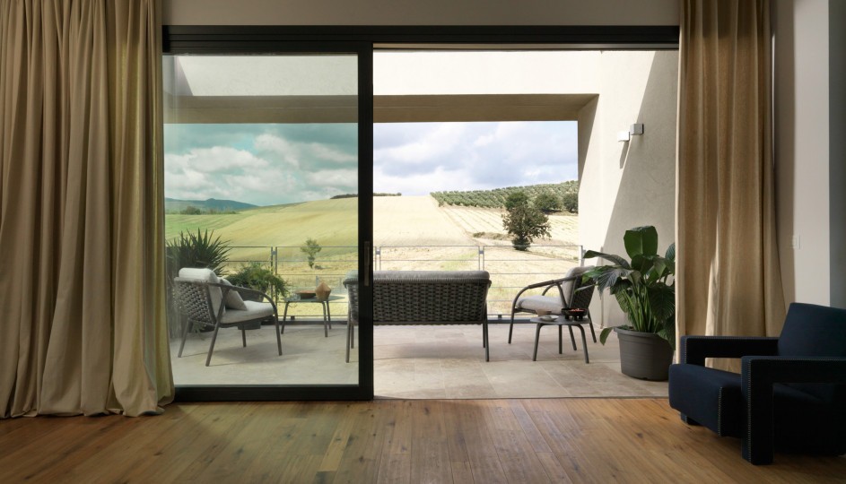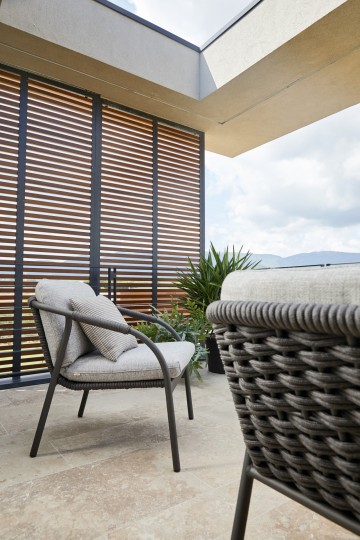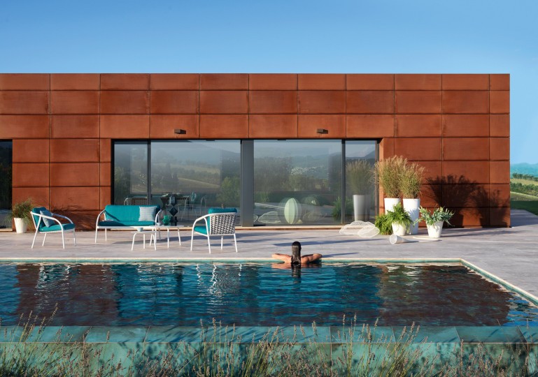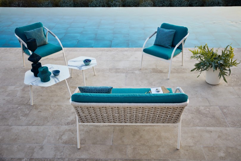 Armchair, aluminum frame powder coated woven with Round Searope. The iconic Italian syle characterizes this chair, whose secret lies in the elegant reinterpretation of classical elements, that inspire pleasure and relax.