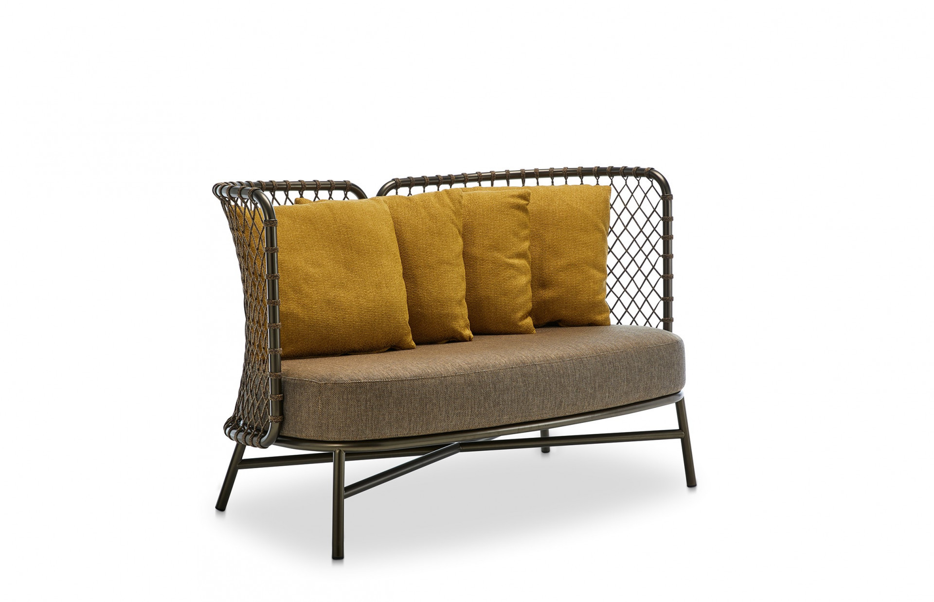 Sofa in powder coated 304 steel, woven with Flat Trendyrope. A cozy sofa, where the special geometry of the backrest is perfectly combined with the desire for comfort, creating a corner to enjoy moments of relax. Excellent for decorating terraces and patios, it also gives a strong personality to indoor living areas. Ideal for residential and contract furnishing.