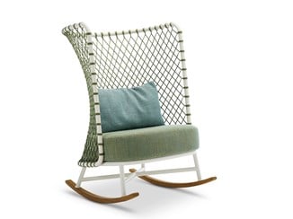 Κουνιστή πολυθρόνα από ατσάλι 304 με επίστρωση βαφής πούδρας, πλέξη Flat Trendyrope, και βάσεις από ιρόκο. Ξεχωρίζει για τις κομψές και ρευστές γραμμές της συνδυάζοντας την άνεση με τον εξαιρετικό σχεδιασμό. Η υφαντή πλάτη προσαρμόζεται φυσικά στο σώμα και δημιουργεί μια επιβλητική και μαζί φιλόξενη ατμόσφαιρα τόσο στους εξωτερικούς όσο και τους εσωτερικούς χώρους καθιστικών, φτιάχνοντας ατμοσφαιρικές γωνίες. Κατάλληλη για κατοικίες, ξενοδοχειακές μονάδες και επαγγελματικούς χώρους.