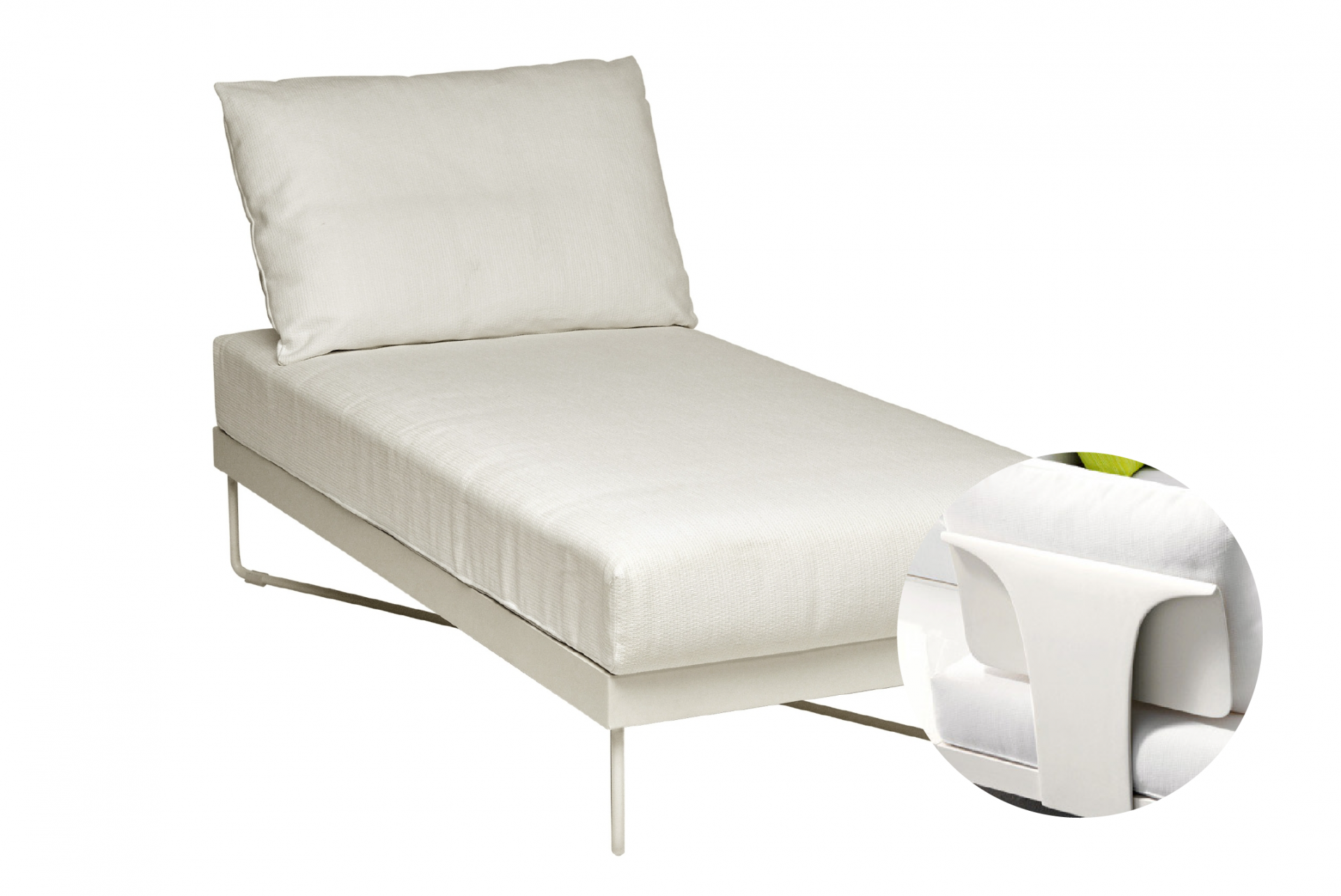 Outdoor lounge-element, aluminum seat, stainless steel frame, back woven with Oval Sunloom.The whole line is modular, its basic design allows to match the various elements in harmony. The woven back gives a richer and elaborate style to the element, a stronger identity. Suitable for terraces, patios, pool areas and lobby for contract projects.